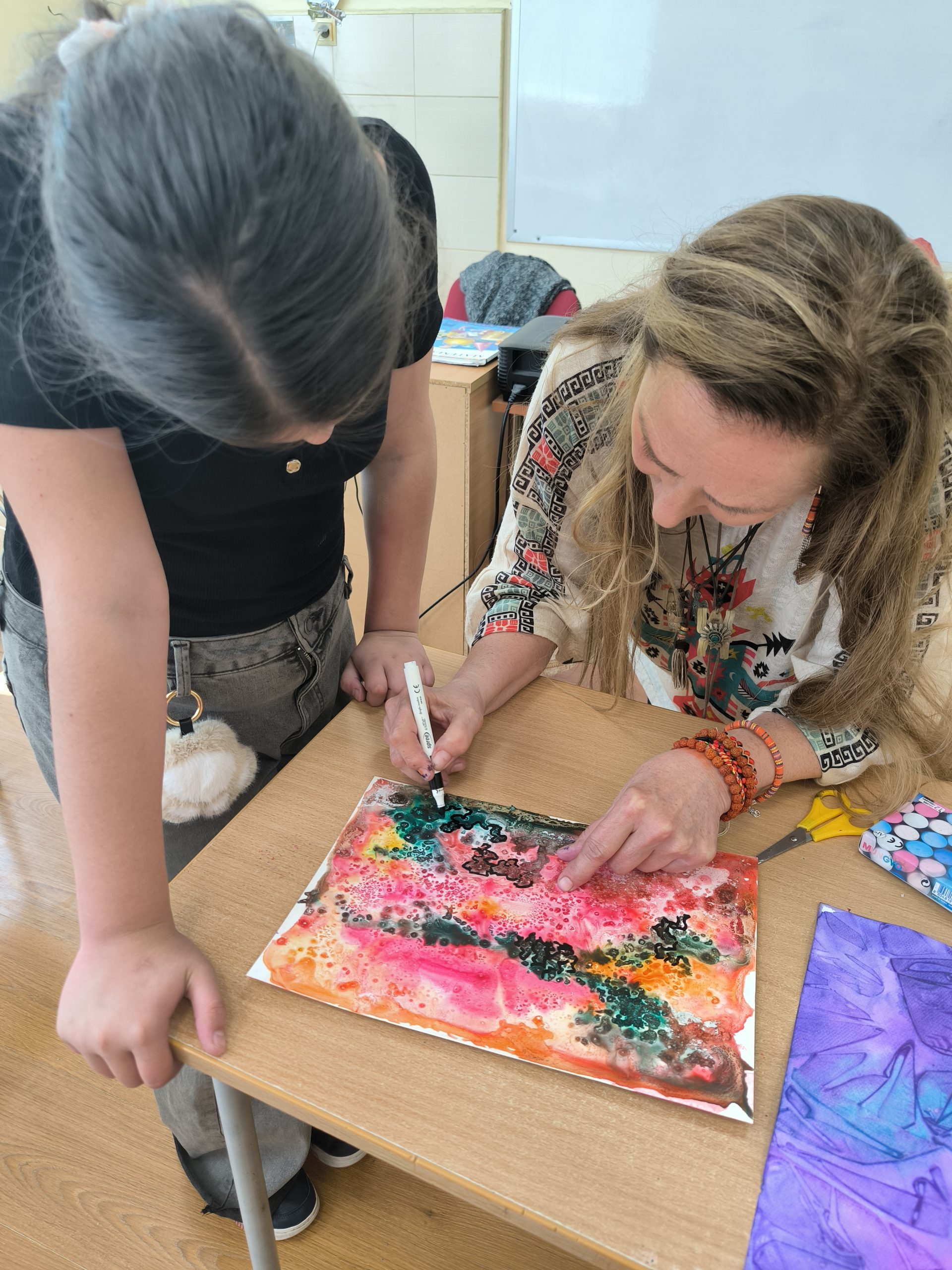 Под вещото ръководство на г-жа Нина Маринова, учениците от 4. б клас с класен ръководител г-жа Дафина Карева, рисуваха абстрактни рисунки. Първо г-жа Маринова направи демонстрация на няколко техники с акварел и акрил. С донесените от нея бои децата твориха с удоволствие и се получиха прекрасни картини с които учениците ще участват в конкурс на Фондация “Димитър Бербатов” за абстрактна рисунка. Пожелаваме успех на всички!
