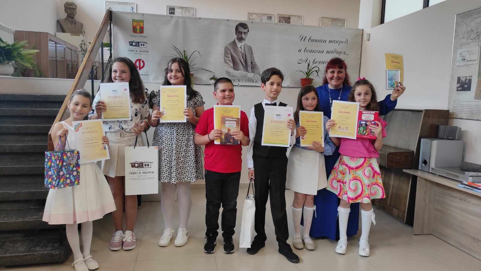 На 13.04. 2024 г. в Къща музей „П. К. Яворов“ се проведе второто издание на Общинския детски конкурс „Детство мое” за рецитация на любимо българско детско стихотворение, в което взеха участие 70 ученици. Изявата започна с поздрав към всички участници от Емма Радева, Ирен Радева, Жанет Костадинова, Мария Димитрова и Стоян Георгиев, които представиха стихотворението „Свада в един килер” от Радой Киров. Компетентното жури в състав: председател Васил Иванов, членове Нейко Генов и Аделина Делчева присъди следните призови места за нашите възпитаници: Първа възрастова група – 4-7 г.Първо място –…