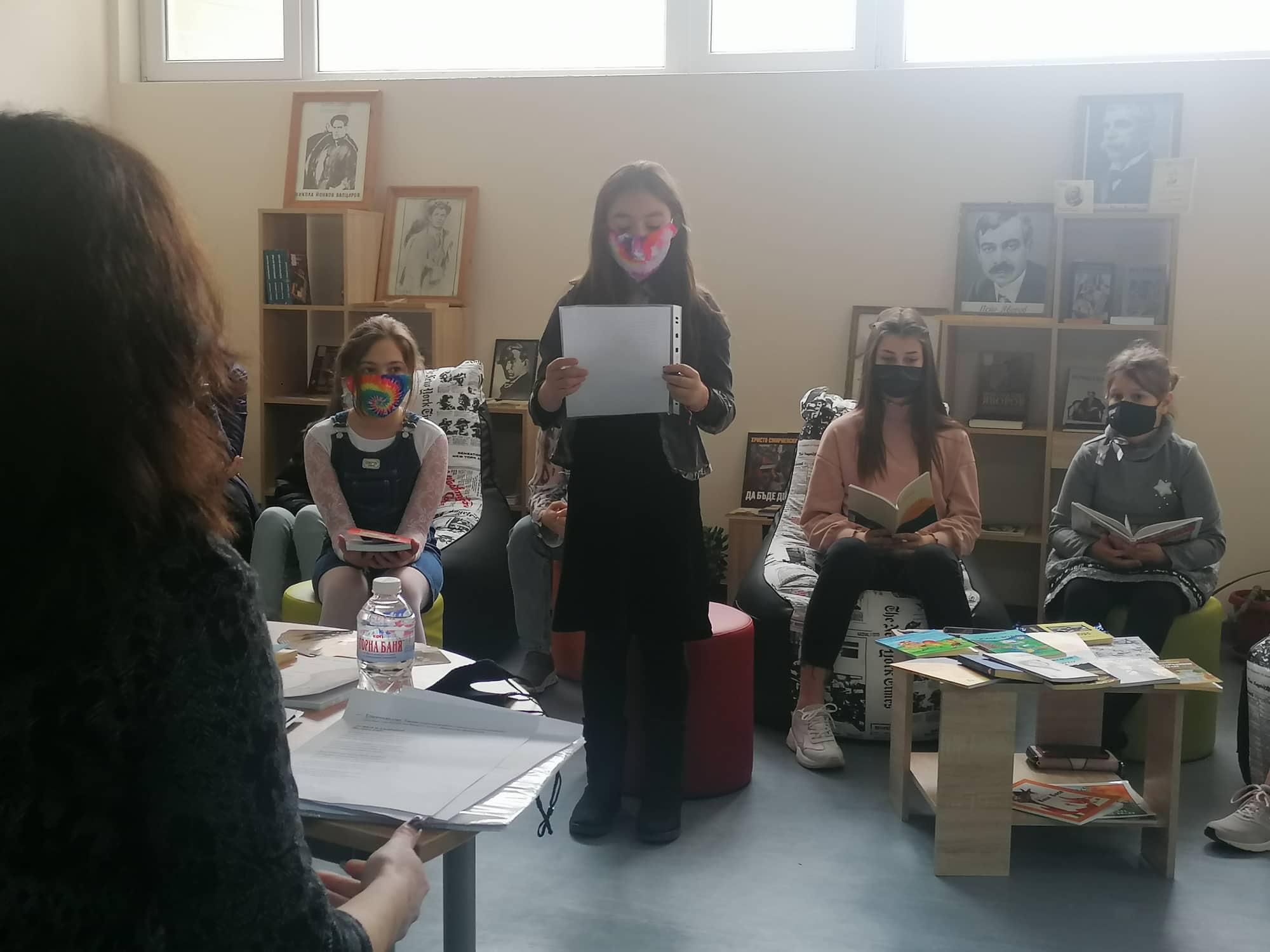 На 15.03.2021 г. от 13, 20 ч. в изнесения кът за четене към библиотеката на СУ “П. К. Яворов”, гр. Чирпан се проведе литературно четене на тема: “Да поговорим за поезия” с лектор г-жа Делиана Начева, уредник в Къща музей “П. К. Яворов”, гр. Чирпан.