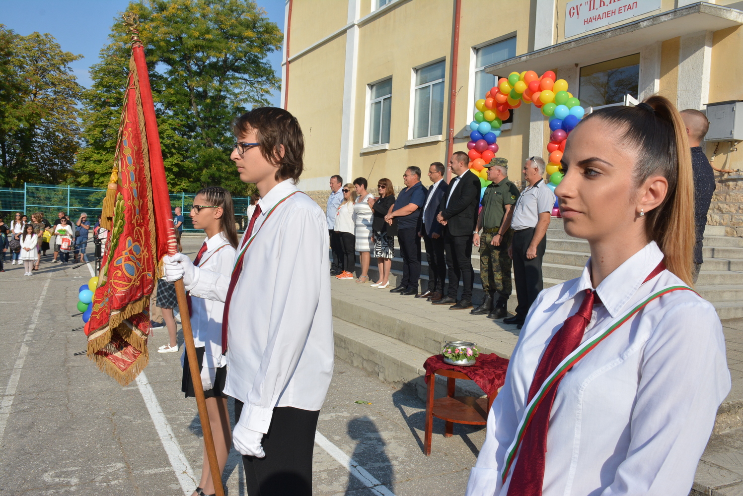 Накрая по стар български обичай с менче вода директорът на училището заедно с класните ръководители поведоха първокласниците през арката от разноцветни балони към техните класни стаи.