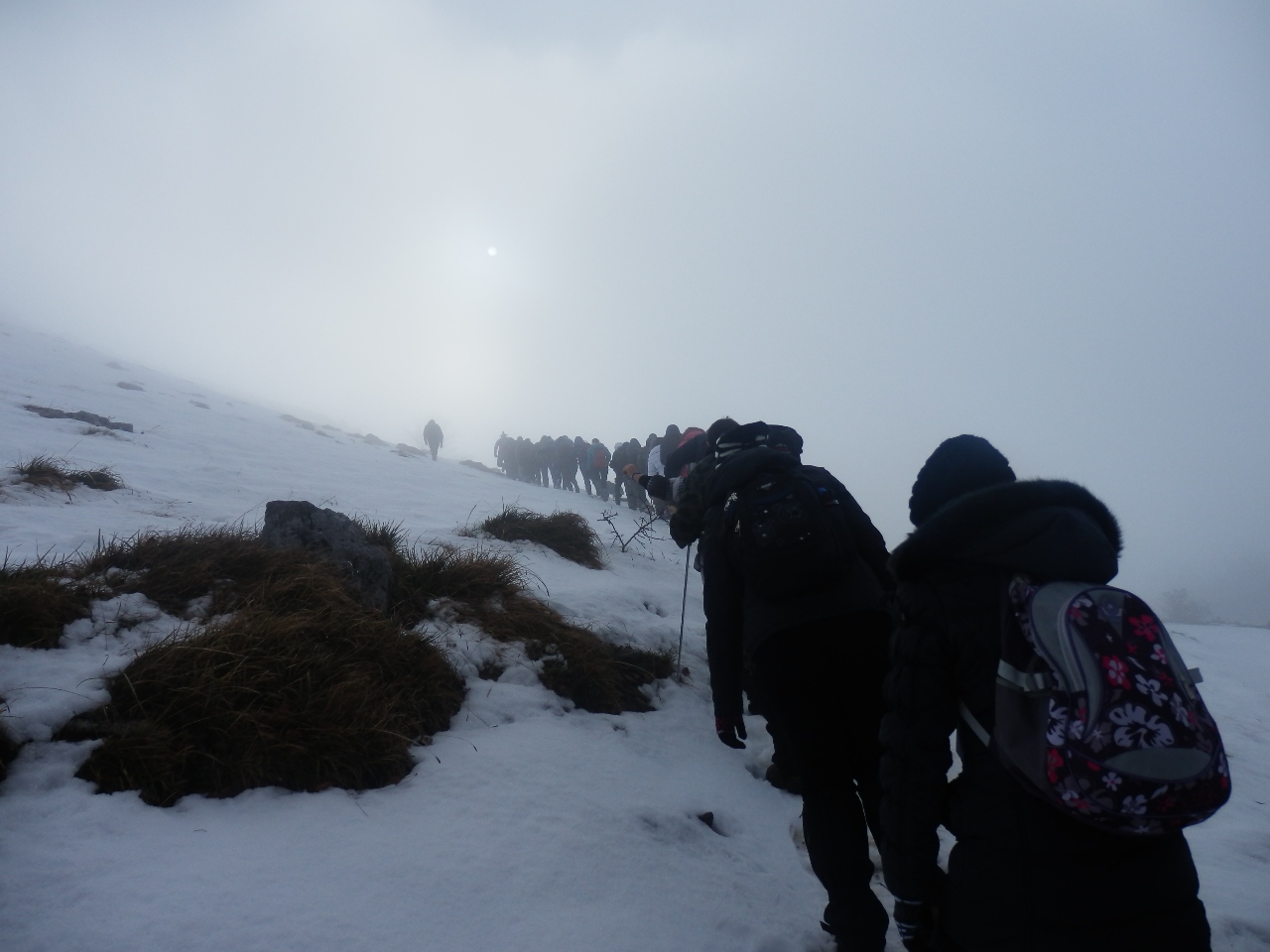 През втория ден на екскурзията проявихме туристическите си възможности. В гъста мъгла и сняг успяхме успешно да покорим връх Шипченски Исполин – 1524 м.н.в. Това се случи и благодарение на нашия водач Иван Мечев, който въпреки затруднените условия не се отказа, намери вярната посока и ни заведе на върха, където мъглата се вдигна и пред нас се разкриха приказни гледки към най-високите части на Стара планина. Въпреки силния вятър на върха всички с чувство на гордост се надпреварвахме да си правим снимки с националния флаг. Най-емоционално за нас обаче беше слизането от върха. Тъй като много се пързаляше и беше почти невъзможно да се върви, момчетата правеха пързалки, а момичетата се спускахме с дъждобраните надолу. Доволни и мокри до кости се прибрахме в топлата хижа. След кратка почивка, игри на закрито, поотпочинали, се отправихме към Географския център на България.