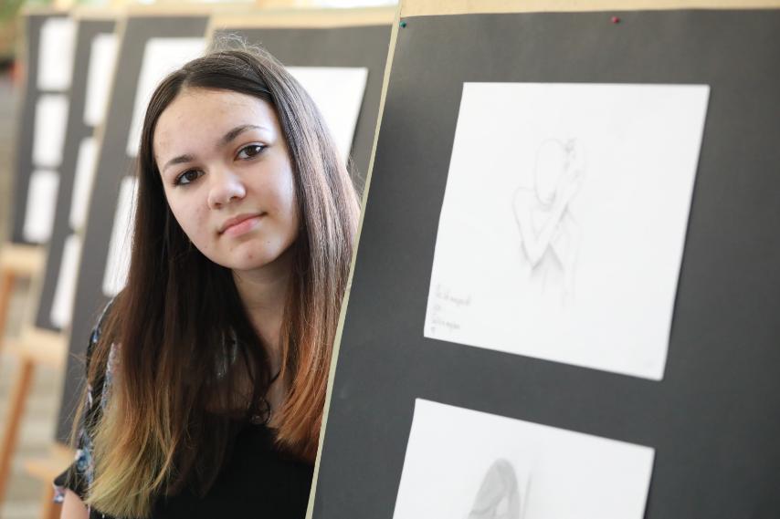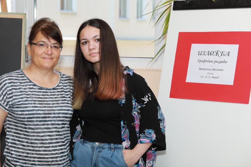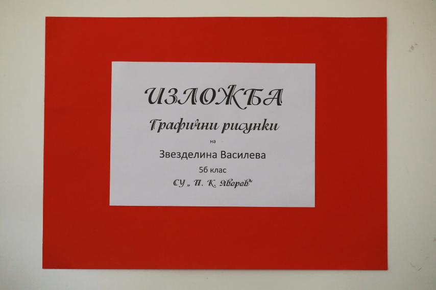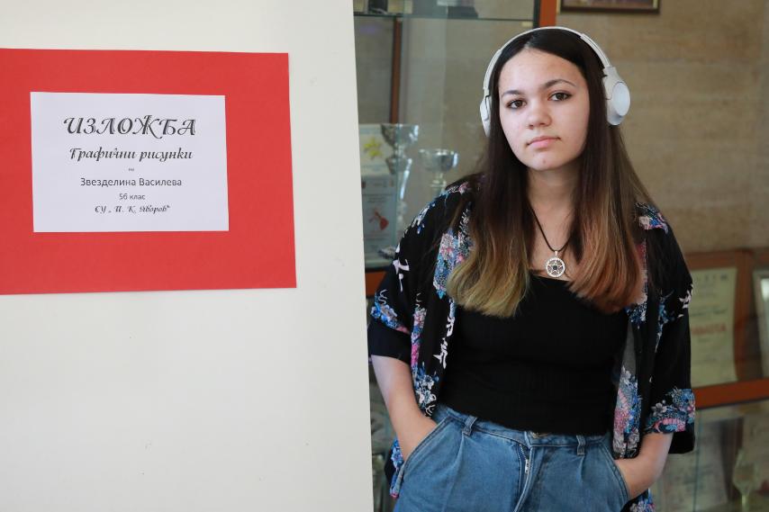 Звезделина Василева е едно интересно и талантливо момиче, което е ученичка от 5. б клас на Средно училище „Пейо Крачолов Яворов“. Тя обича да рисува и прави това с много любов и въображение. Вдъхновява я дълбочината на човешката душа, а емоциите, които изпитва човек винаги се отразяват на лицето, затова тя предпочита чрез графики да запечатва тези емоции върху белия лист. По този начин момичето релаксира, защото музиката и графичната рисунка й помагат да избяга в необятния свят на изкуството. С подкрепата на г-жа Мими Георгиева, тя подреди във фоайето на училището своите творби, които всички могат да разгледат.