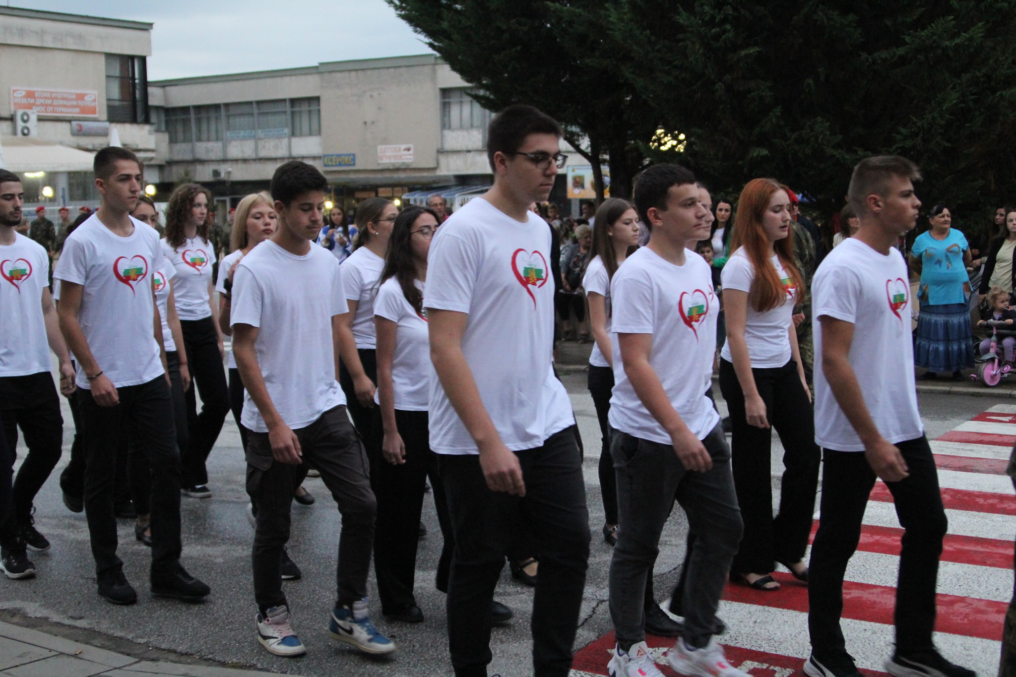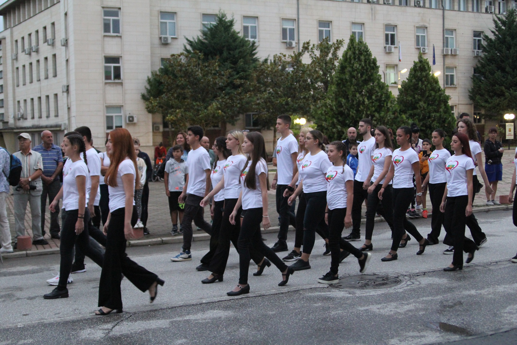 Момичета и момчета от 7. до 12. клас, част от Театралното студио и ТС „Тракийска броеница“ към СУ „П. К. Яворов“, съставиха блока на учениците, представил училището.