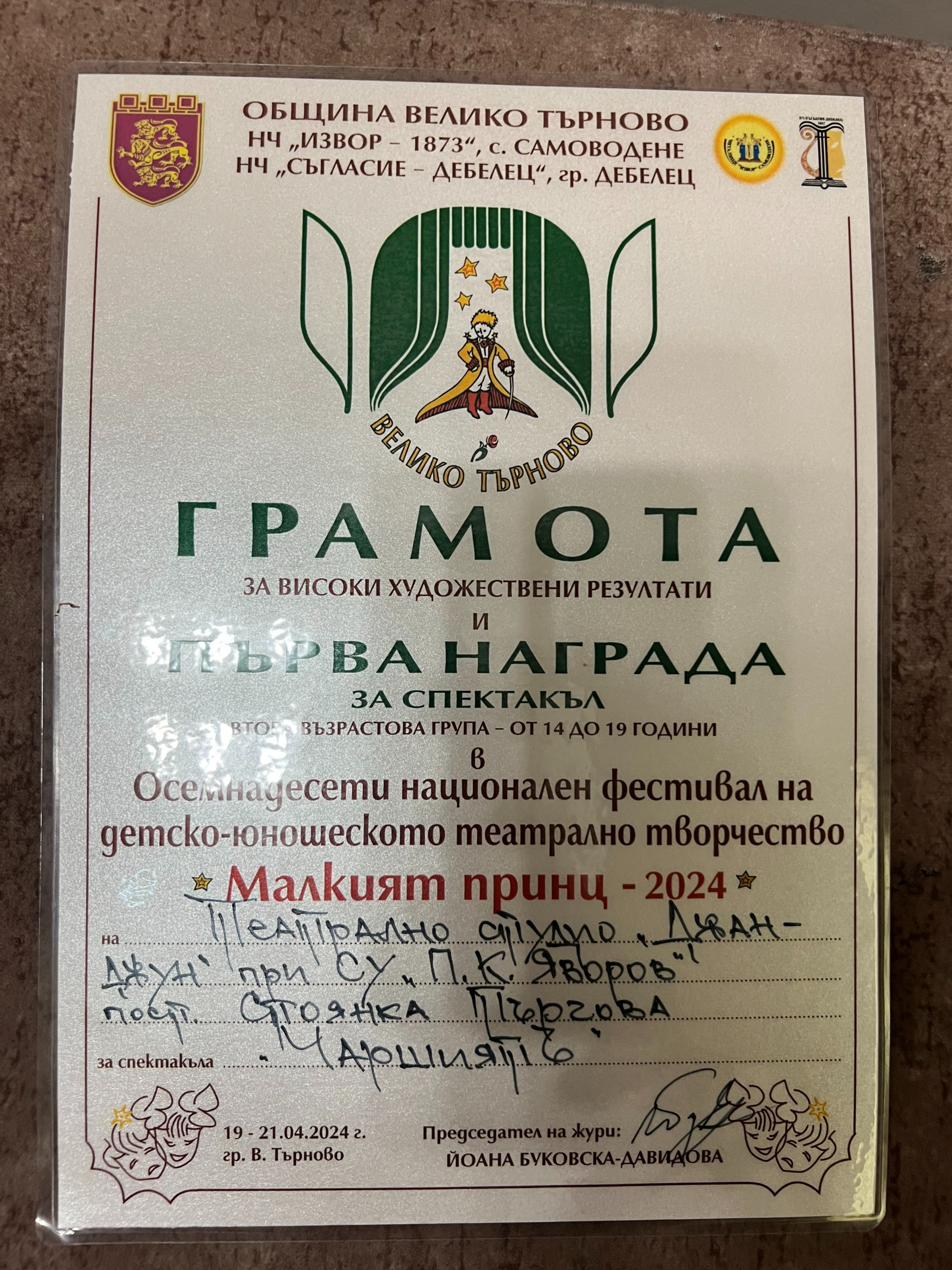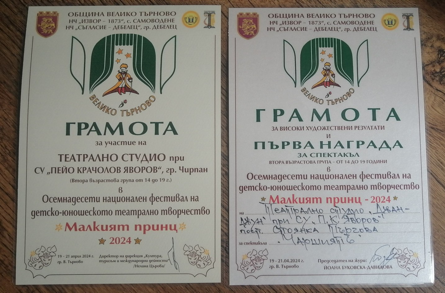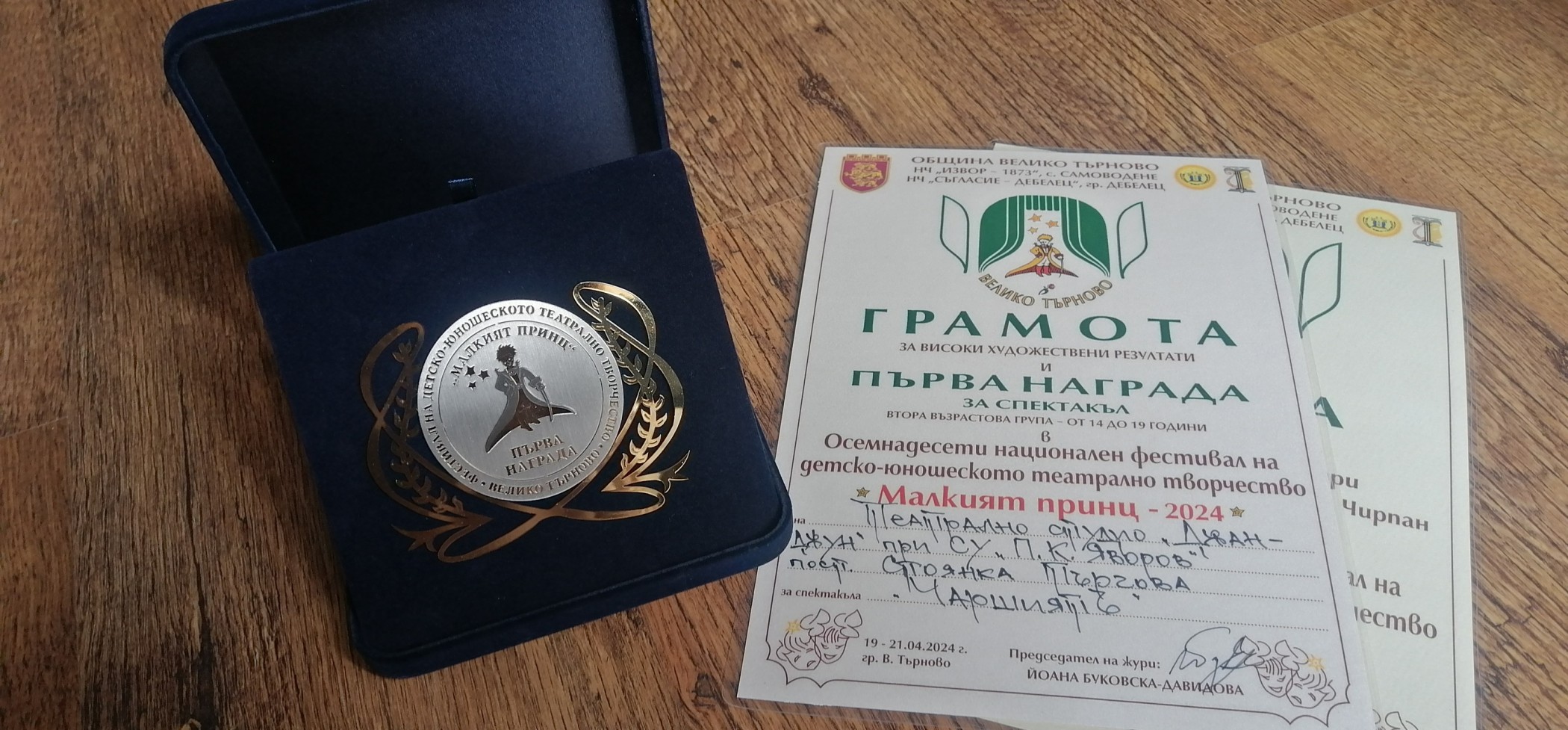 Участниците в “ЧаршиятЪ” – Театрално студио “Джан-джун”, Танцов състав “Тракийска броеница” и Танцов състав “Светулки”, извоюваха първата награда при непрофесионалистите. Техни ръководители бяха Стоянка Търгова, Силвия Мечева и Дафина Карева. Признанието донесе огромна радост за всички участници и стимул да се представят подобаващо и на театралния фестивал в град Казанлък след седмица.