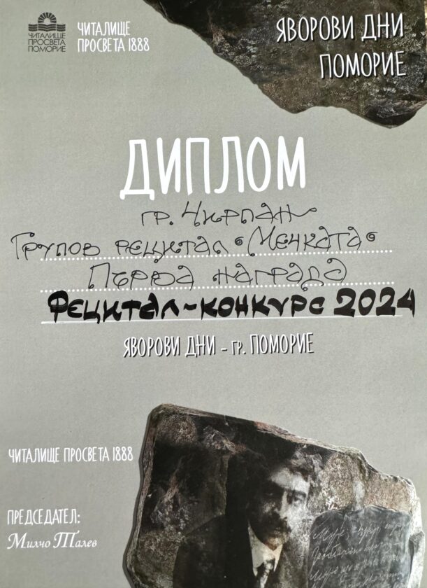 Това е доста тежък конкурс, почти на професионално ниво, но децата на училищего ни се справиха блестящо. Приятна изненада е ПЪРВАТА награда за груповото изпълнение на петимата от „Джан-джун“, които се представиха с част от „Хайдушките копнения“ на Яворов, озаглавена „Мечката“ и тяхното изпълнение беше част от тържествената вечер, на която се връчиха наградите от всички обявени конкурси и бяха закрити Яворовите празници в Поморие.