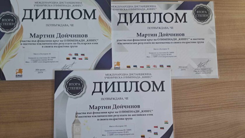 Мартин Иванов Дойчинов, ученик от 7.А клас, представил се успешно в квалификационните кръгове, достигна до финален кръг по български език, английски език и математика. Удовлетвореност за седмокласника са получените дипломи, които потвърждават постигнатото ниво на знания. По английски език Мартин достигна Кралската лига и получи Златен медал, което му дава възможност да попадне в националния отбор на Kings Bulgaria.