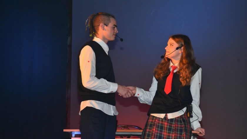 След това започна спектакълът, в който повече от час на сцената учениците пресъздадоха по-важните моменти от историята на училището си. Първата част беше историческа – с разкази на водещите и мултимедия оживяха чрез архивни кадри и снимки по-важните етапи от развитието на училището. Втората част – „Здравей, непозната”, бе драматургична, а на сцената учениците от театралното студио в лирично-есеистичен и в музикално-танцов план успяха да преплетат по забавен начин минало и настояще.