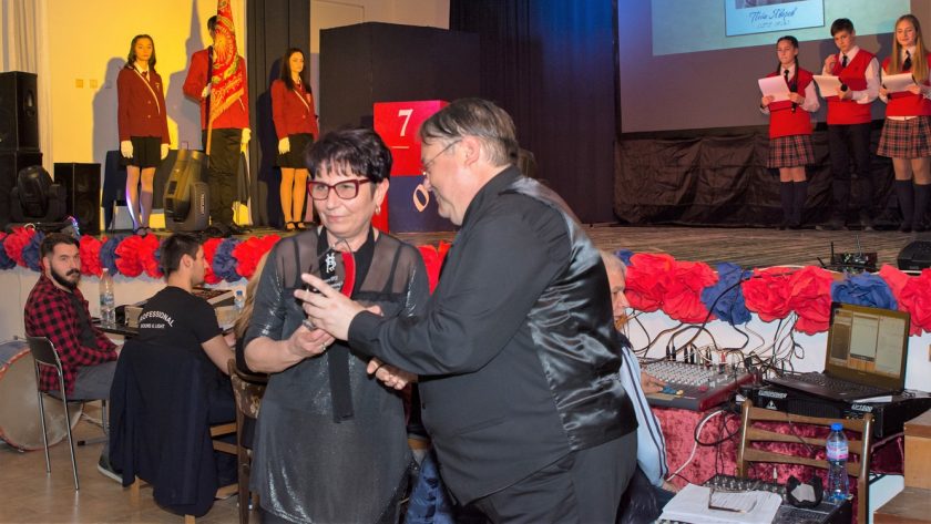 Директорът на училището и г-жа Делка Стратева, в чиито ръце е почетният плакет по повод юбилея на училището
