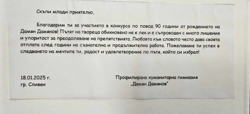 По случай рождения ден на поета и патронния празник на училището Профилирана хуманитарна гимназия „Дамян Дамянов“, гр. Сливен обяви традиционни конкурси: литературен-за учители, и за ученици-електронна книга, рецитация и рисунка.