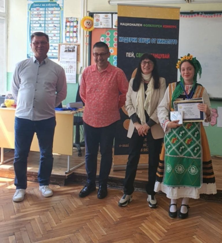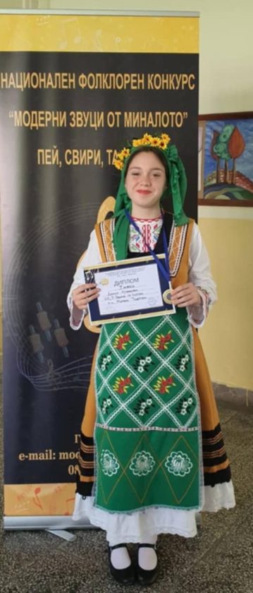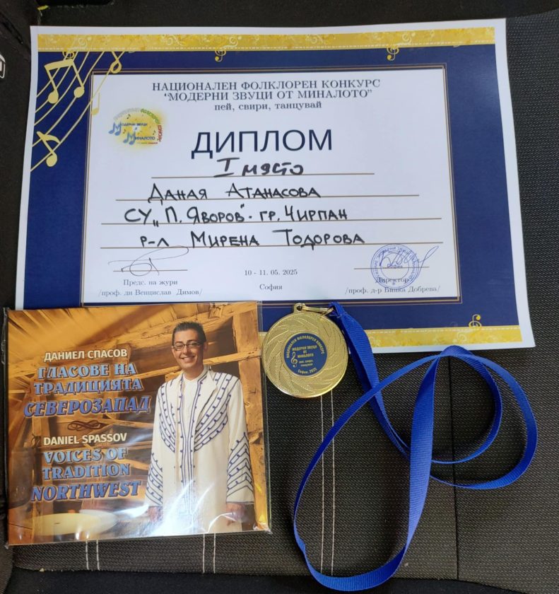 На 10.05.2025г в гр.София се проведе Национален фолклорен конкурс “Модерни звуци от миналото” Даная Йорданова ученичка от шести клас с р-л Мирена Тодорова получи специална покана за участие от известната народна певица Бинка Добрева,която е организатор на конкурса. Младата и талантлива чирпанска изпълнителка успя да спечели сърцата на журито с песента “Злато моме” изпълнявана от нашата съгражданка Атанаска Тодорова и “Гергана пиле шарено” от репертоара на Бинка Добрева.Тези две изпълнениения успяха да и завоюват първо място и златен медал.