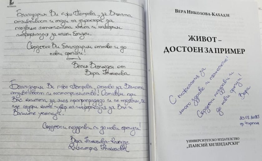 В библиотеката на тяхното внимание бе предоставена летописната книга, както и трите юбилейни книги, отразяващи развитието на училището. За тяхна голяма радост материалите съдържаха важна информация за техните предци. На 23.09. авторката отново посети библиотеката, за да изкаже сърдечни благодарности на ръководството и на библиотекаря за оказаното ѝ съдействие. Книгата „Живот, достоен за пример“ вече е факт. “В известен смисъл тази книга беше написана още преди тридесет години-дълбоко в моето подсъзнание, когато за първи път чух от баба ми, Кати, името на прапрапрадядо Димитър.