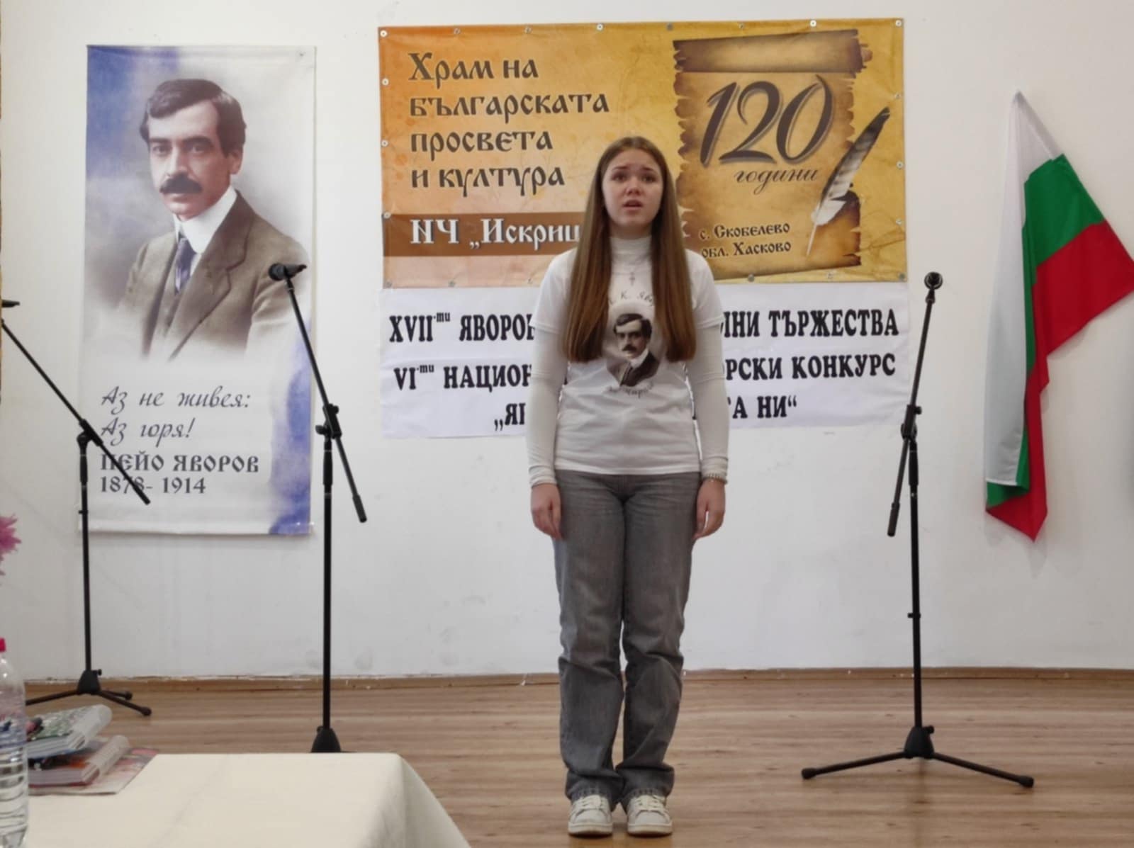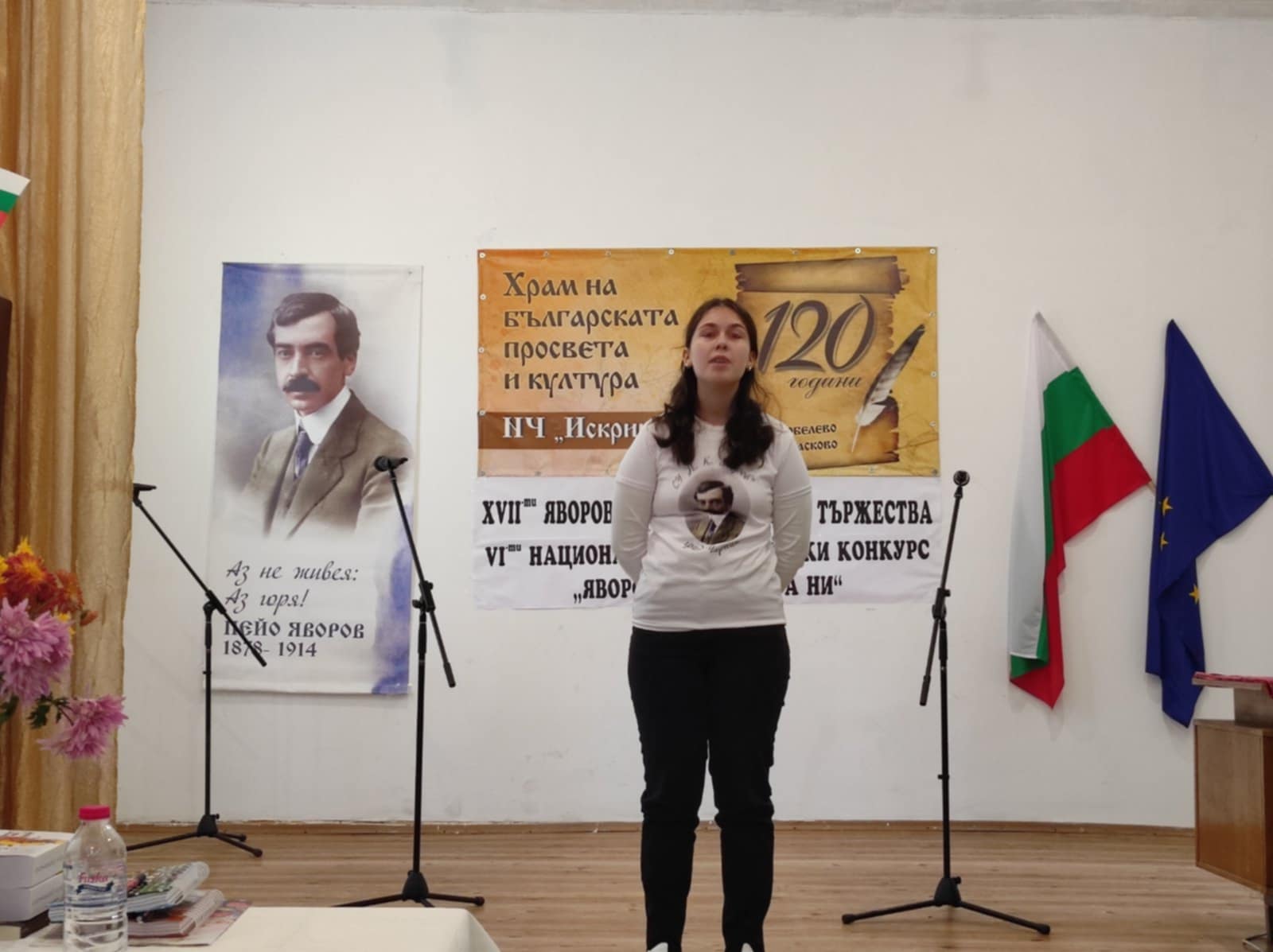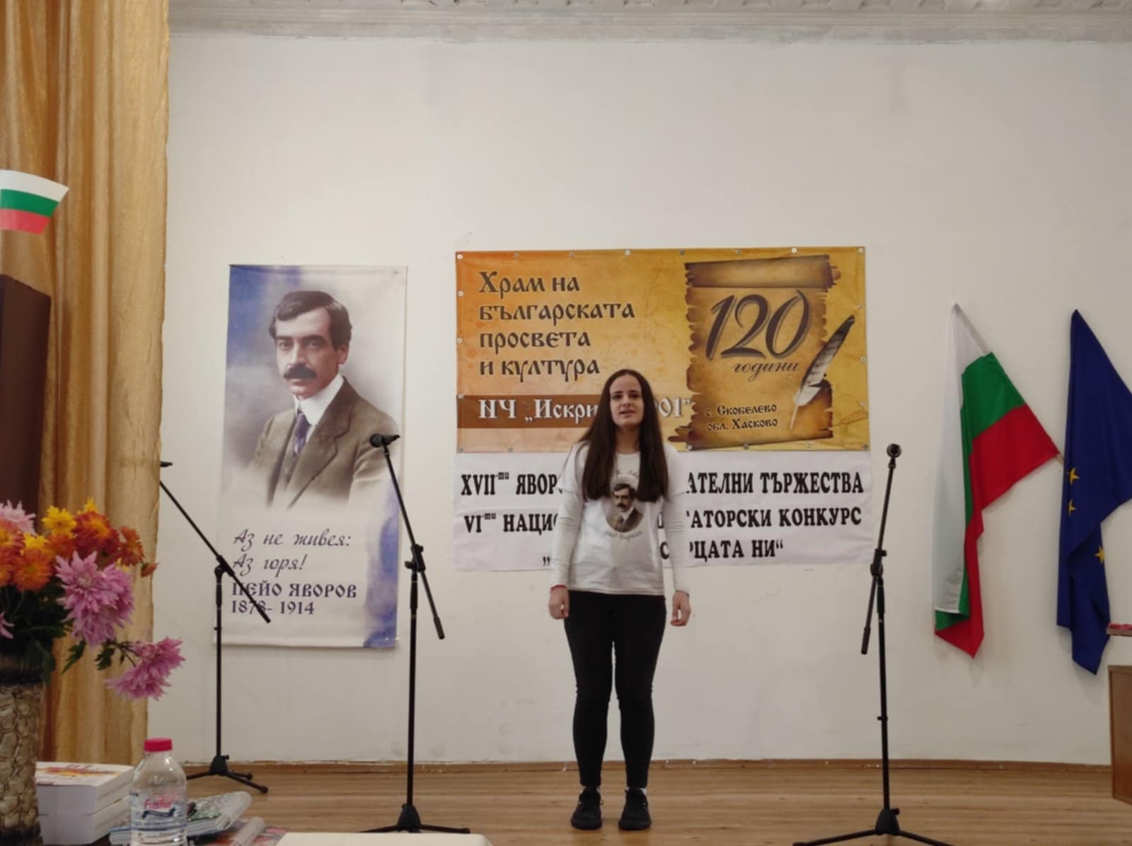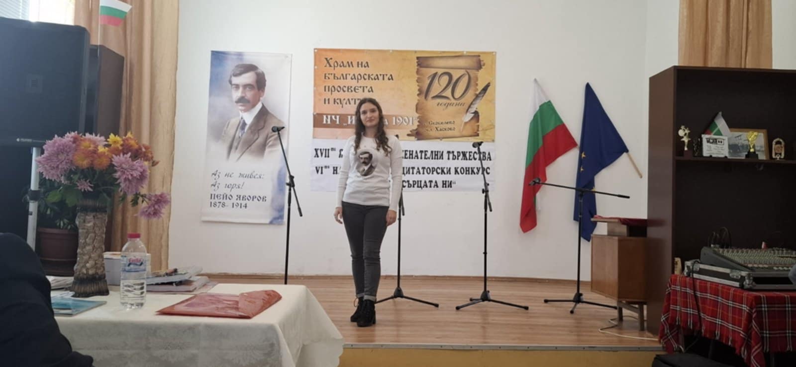 В VI Национален рецитаторски конкурс “Яворов е в сърцата ни”, организиран съвместно с Къща музей “Пейо Яворов” и Фондация “Яворов”, град Чирпан и Община Димитровград, участие с индивидуални изпълнения взеха седмина гимназисти с ръководител г-жа Недка Петрова. Компетентното жури с председател г-н Кольо Петров присъди две призови награди: