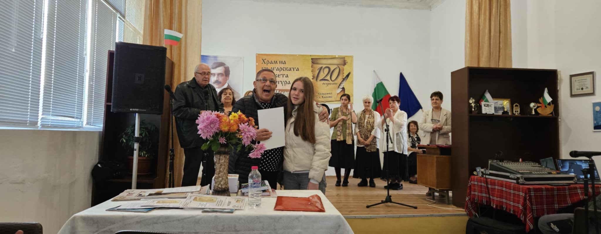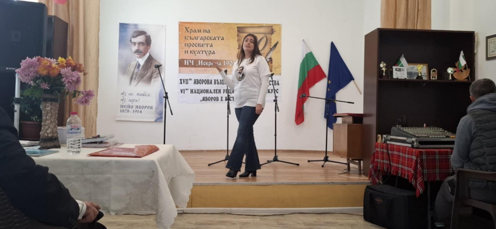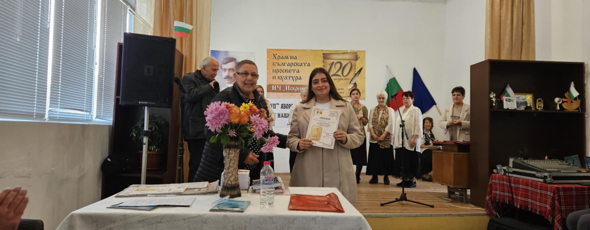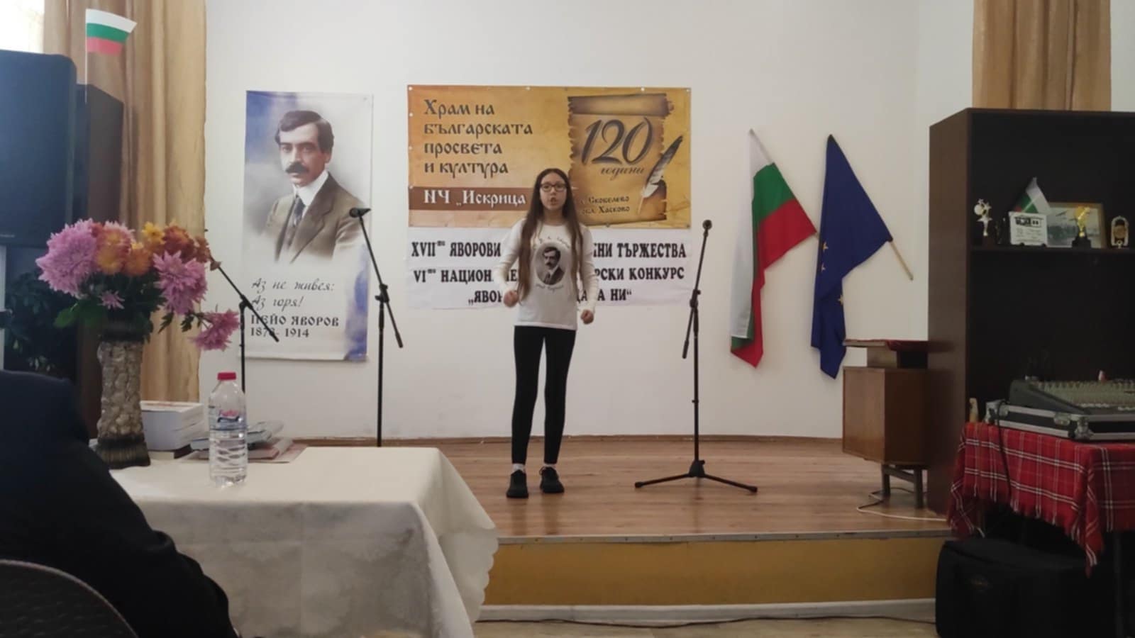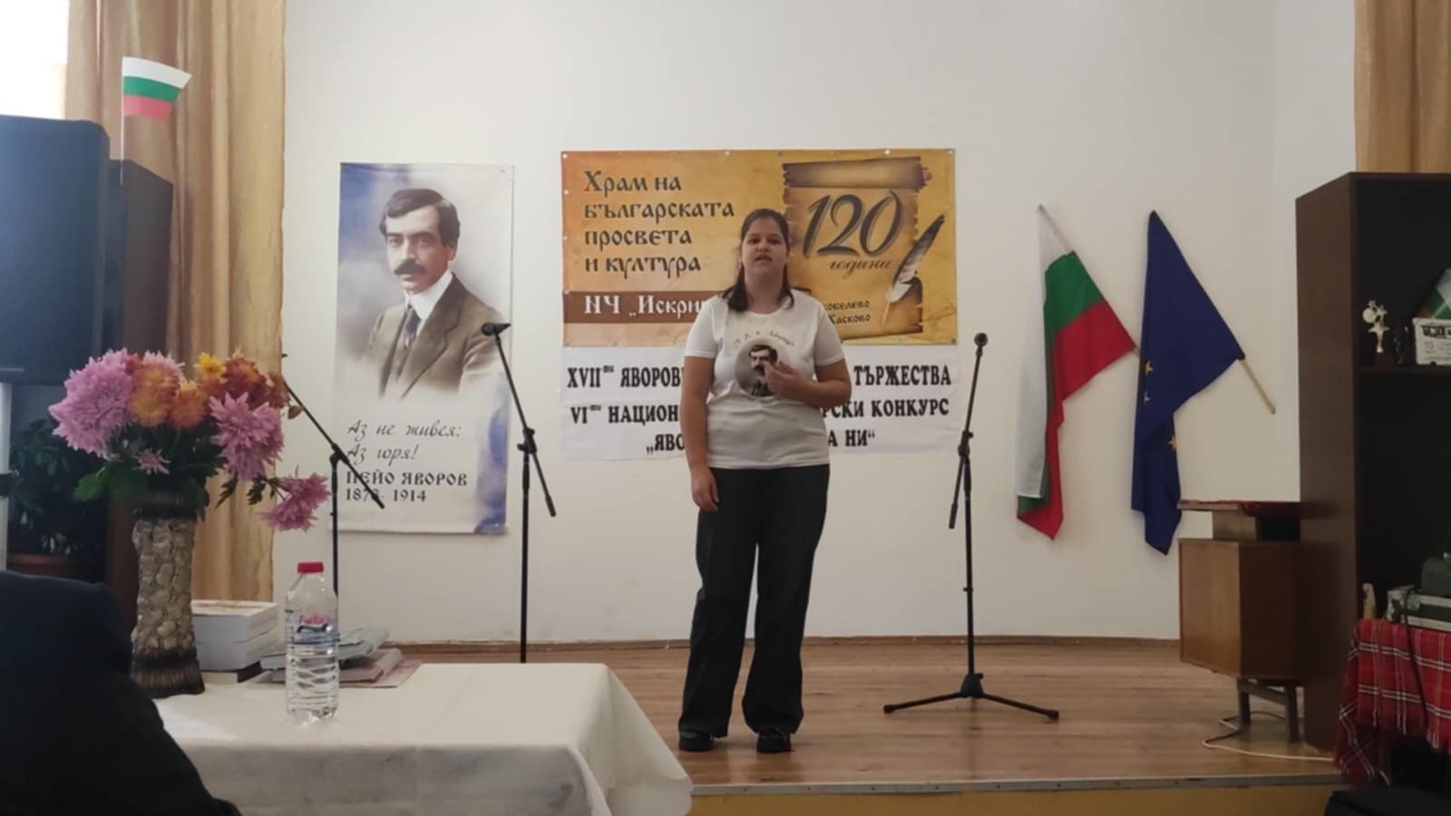 В VI Национален рецитаторски конкурс “Яворов е в сърцата ни”, организиран съвместно с Къща музей “Пейо Яворов” и Фондация “Яворов”, град Чирпан и Община Димитровград, участие с индивидуални изпълнения взеха седмина гимназисти с ръководител г-жа Недка Петрова. Компетентното жури с председател г-н Кольо Петров присъди две призови награди: