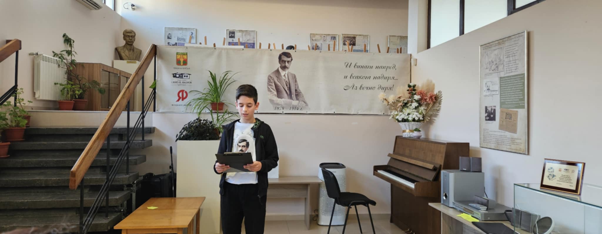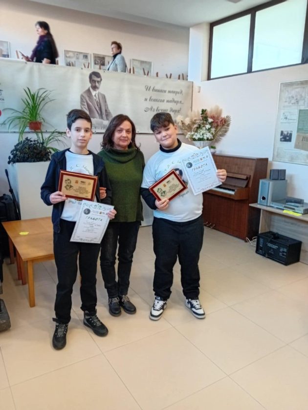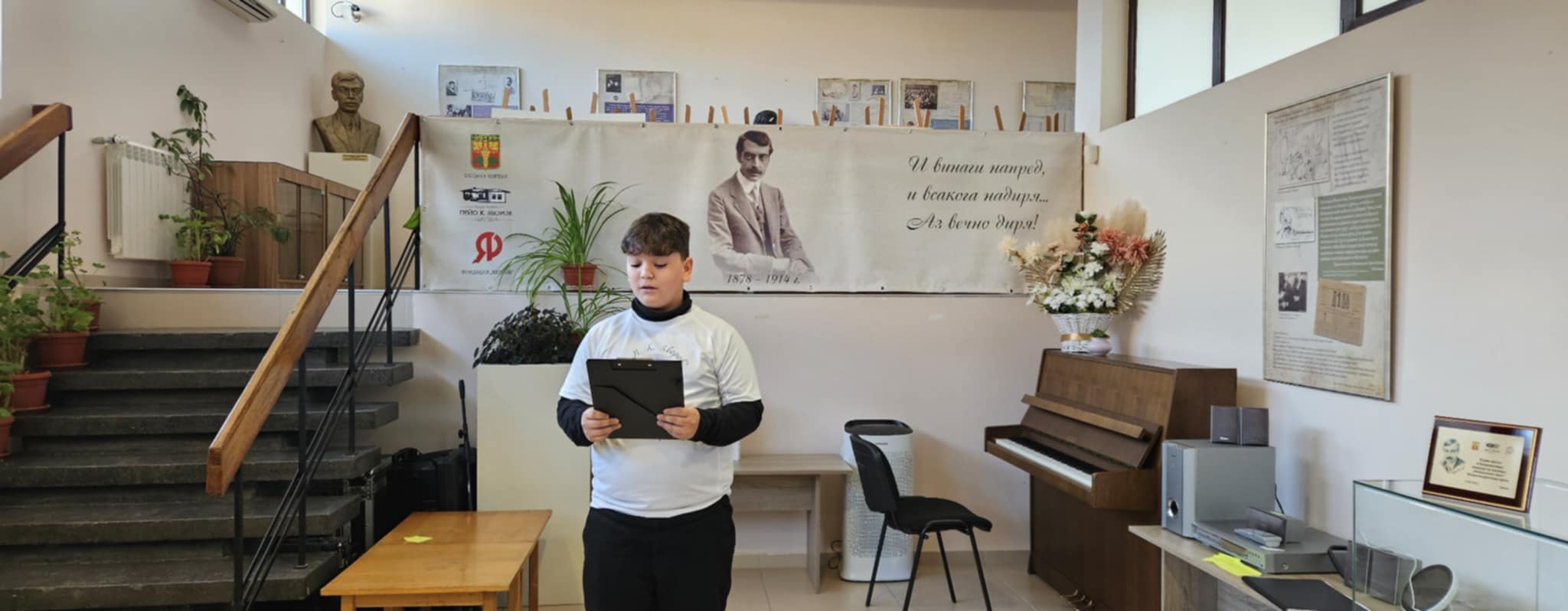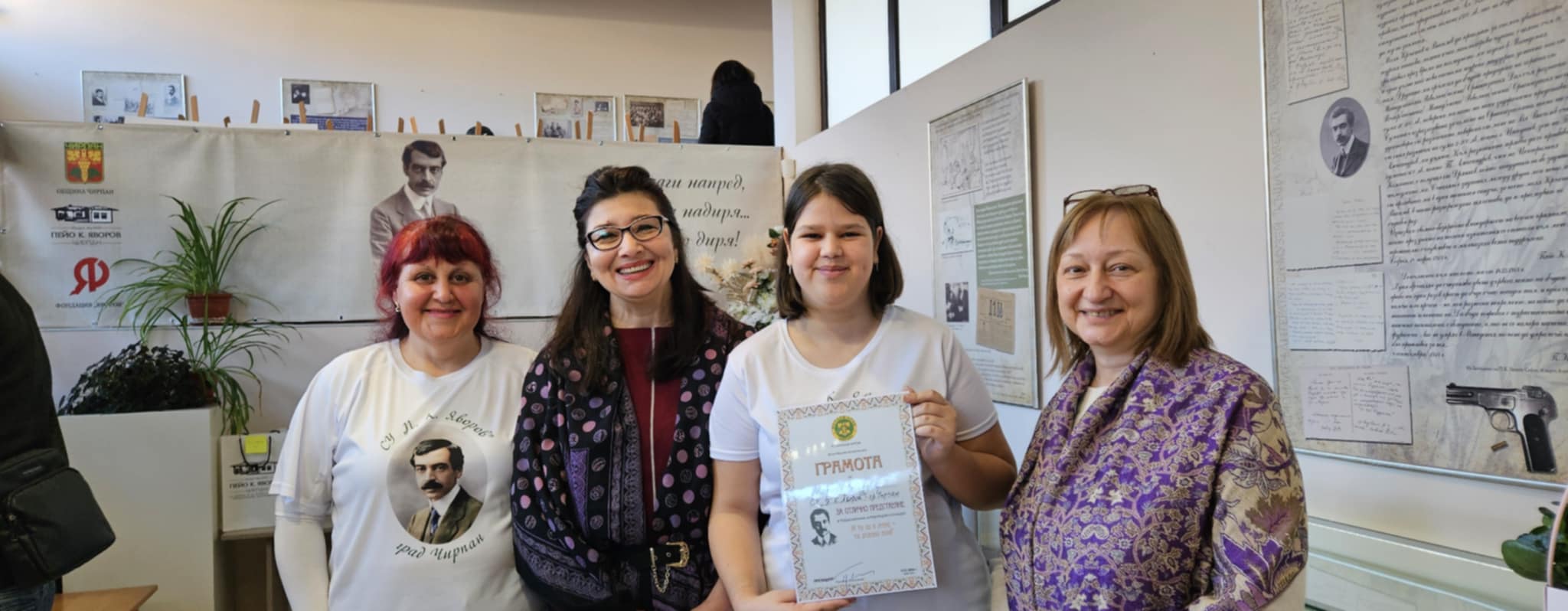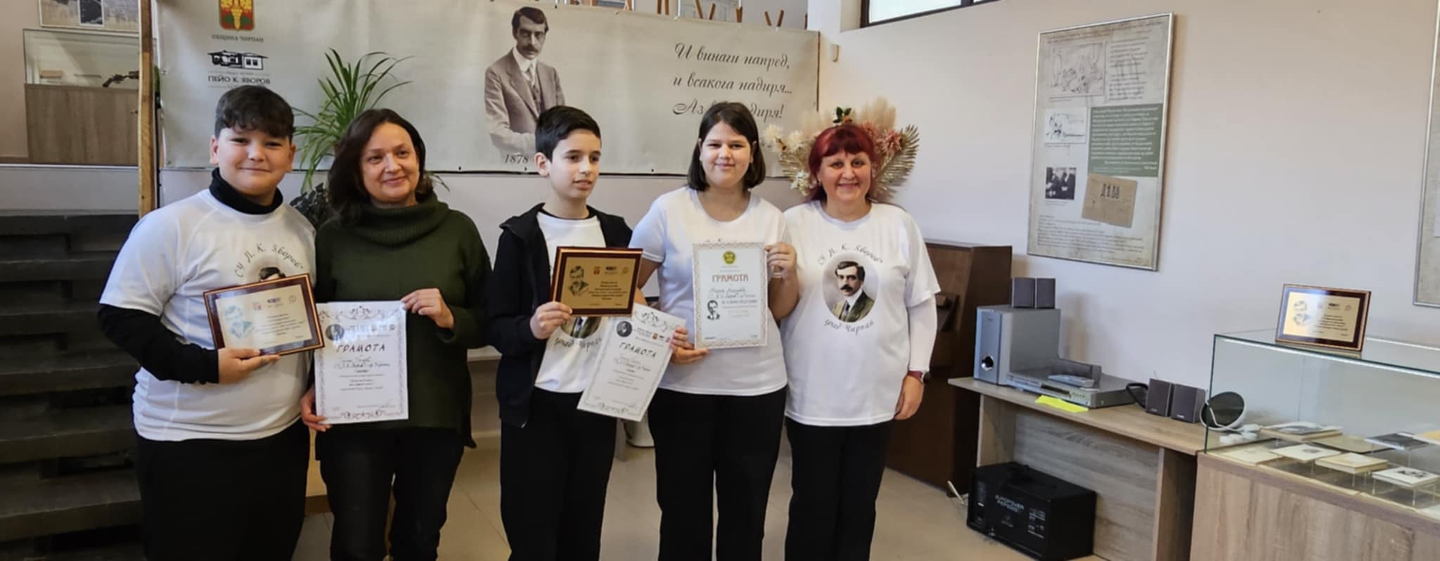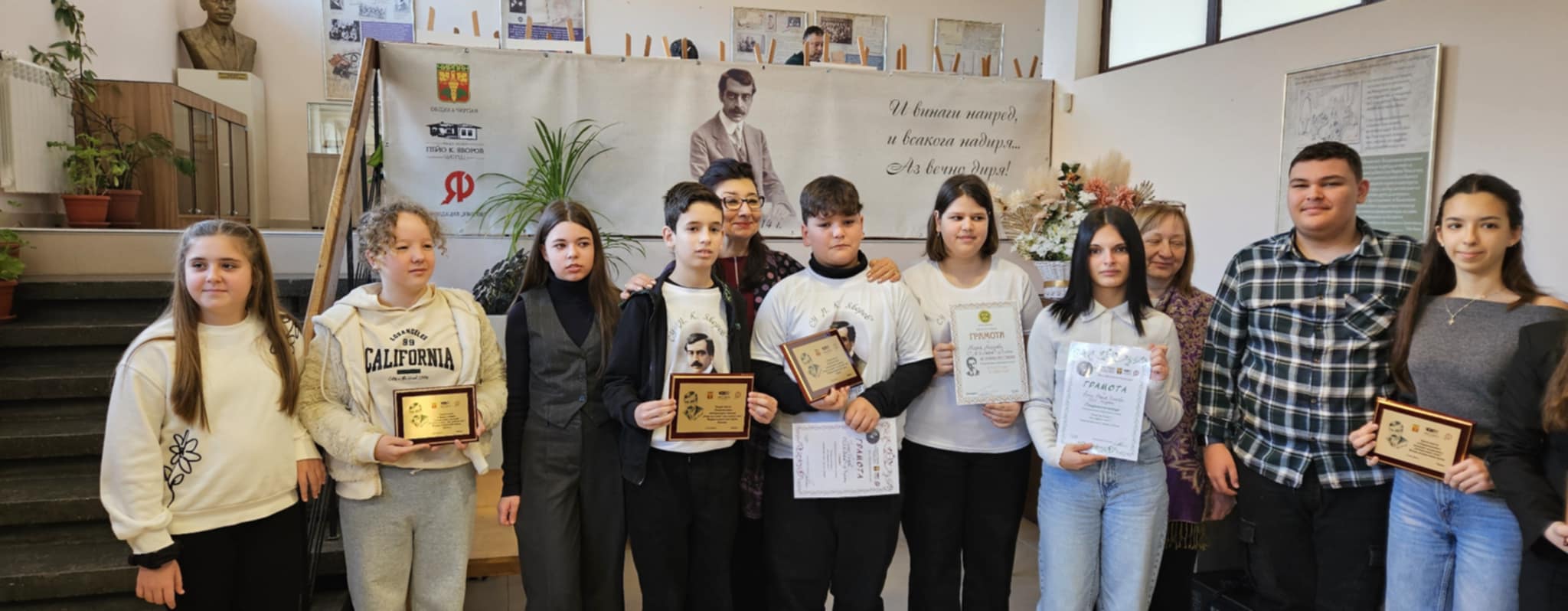 Тази година в Националния литературен конкурс „И ти си в мене-ти, родино моя“ на Къща музей „Пейо К. Яворов“ и Фондация „Яворов“, част от 58-те Яворови януарски дни-148 г. от рождението на Яворов, взеха участие 50 ученици от цялата страна с общо 56 творби. Жури в състав: поетесата д-р Ахавни Кеворкян, председател на Дружеството на писателите, гр. Пловдив, председател на журито, и членове: поетесите Елена Диварова и Делиана Начева, уредник в Къща музей „Пейо К. Яворов“, гр. Чирпан заслужено отличиха трима млади творци от нашето училище: