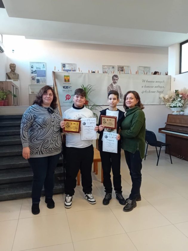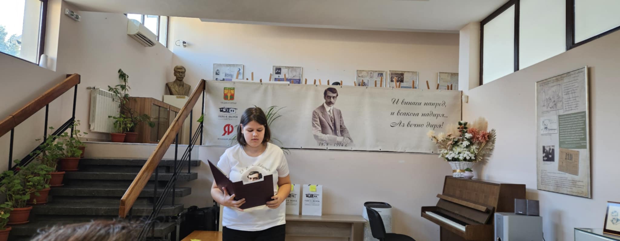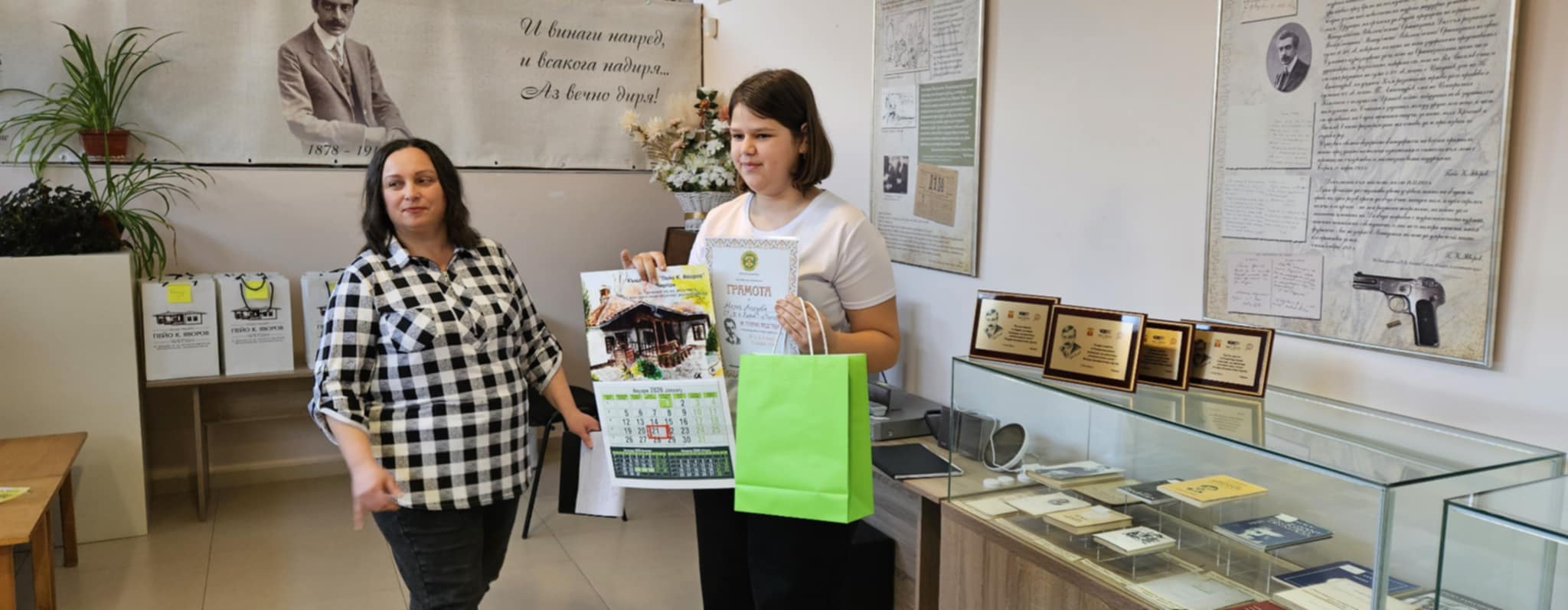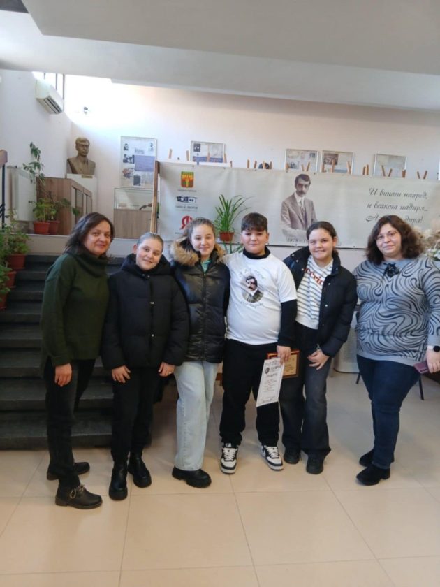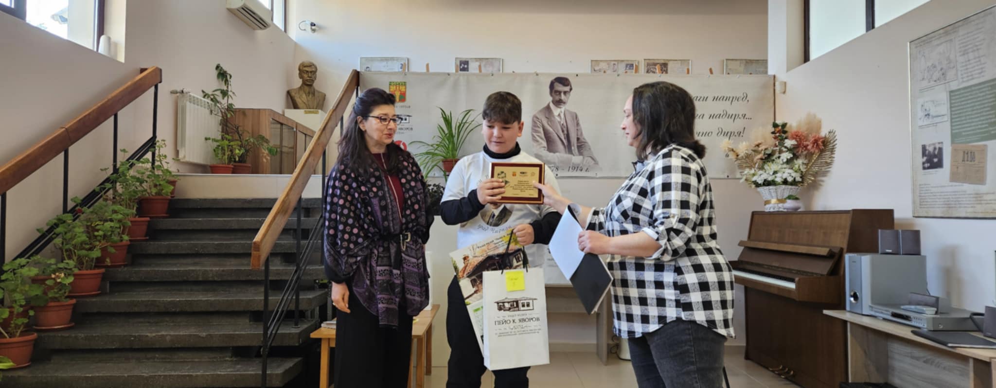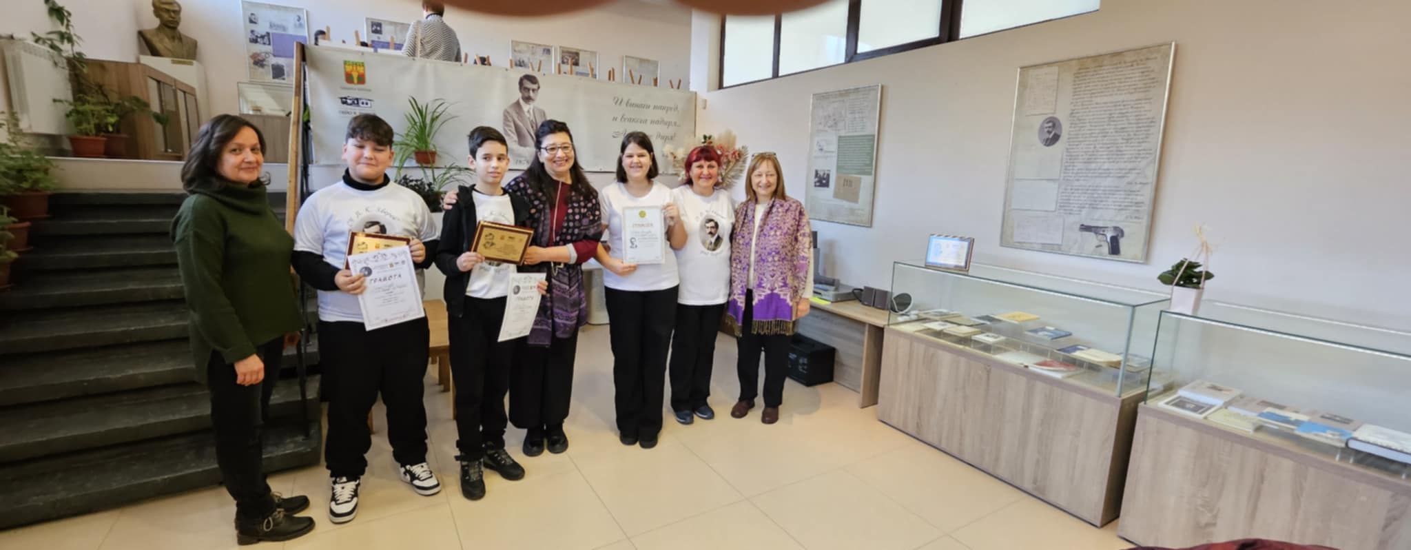 Тази година в Националния литературен конкурс „И ти си в мене-ти, родино моя“ на Къща музей „Пейо К. Яворов“ и Фондация „Яворов“, част от 58-те Яворови януарски дни-148 г. от рождението на Яворов, взеха участие 50 ученици от цялата страна с общо 56 творби. Жури в състав: поетесата д-р Ахавни Кеворкян, председател на Дружеството на писателите, гр. Пловдив, председател на журито, и членове: поетесите Елена Диварова и Делиана Начева, уредник в Къща музей „Пейо К. Яворов“, гр. Чирпан заслужено отличиха трима млади творци от нашето училище: