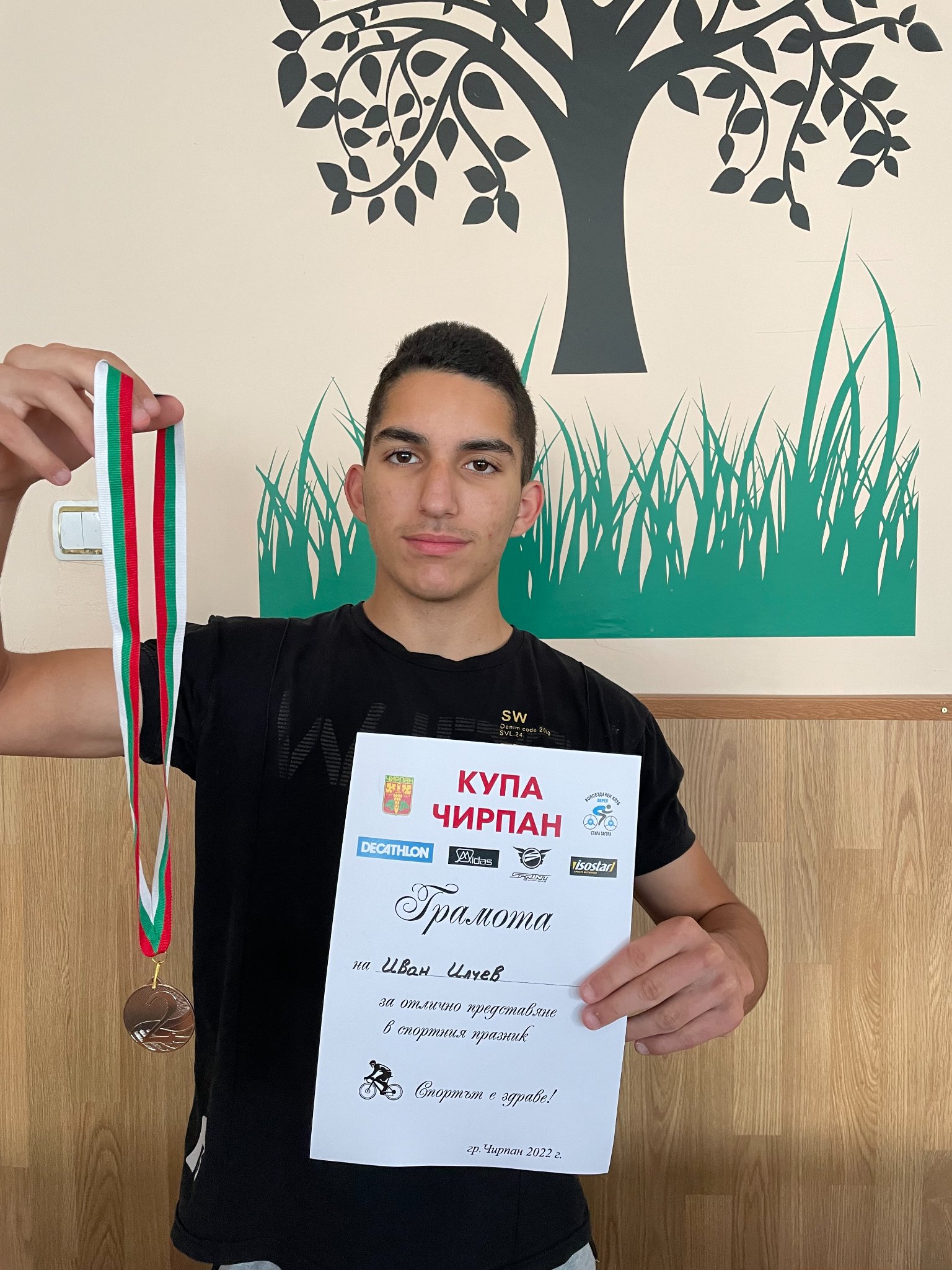 В третото издание на колокритериума за купа „Чирпан“, което събра на стартовата линия над 200 участници от колоездачни клубове от цялата страна, сред любителите колоездачи беше и Иван Илчев от 10. б клас, който финишира секунди след победителя и се класира на второ място. На 14 май в град Чирпан колокритериумът бе организиран от Община Чирпан, Колоездачен клуб “Верея- Чирпан” и Българската федерация по колоездене (БФК). Пожелаваме на Иван още много колоездачни победи!