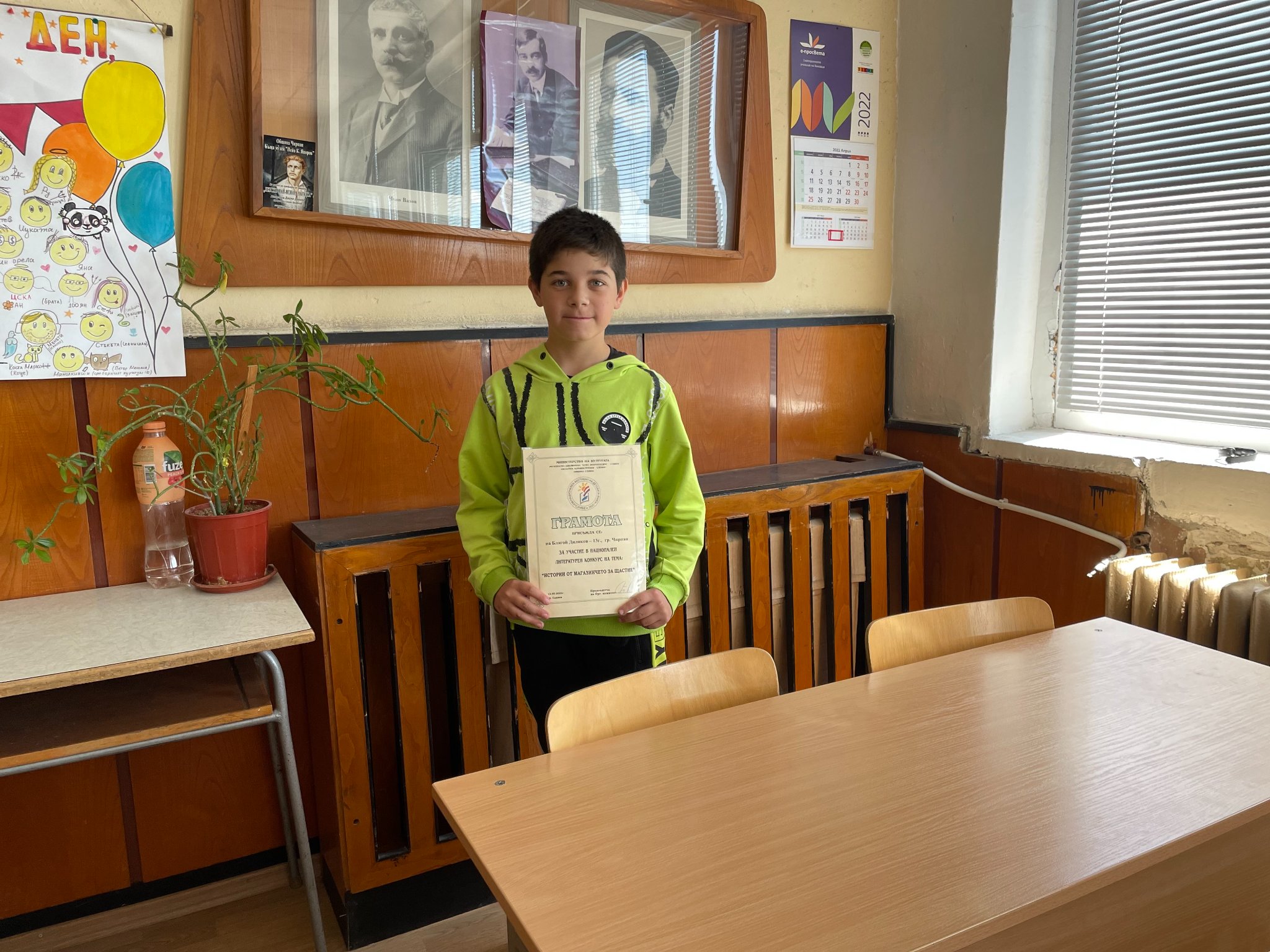 От 11 до 13 май 2022г., в град Сливен се проведе Национален фестивал на детската книга. Една от проявите, която провокира въображението на тийнейджърите от цялата страна и от българските общности в чужбина, бе обявеният Национален литературен конкурс на тема „Истории от магазинчето за щастие“. Двама седмокласници от нашето училище, подкрепяни от своя преподвател по български език и литература г-жа Петя Николова, изпратиха творбите си. Грамоти за участие получиха Благой Христов Диляков от 7.а клас за разказа „Подаръкът на мама- късче от нейното сърце“ и Михаил Георгиев Вълчев от 7.в…