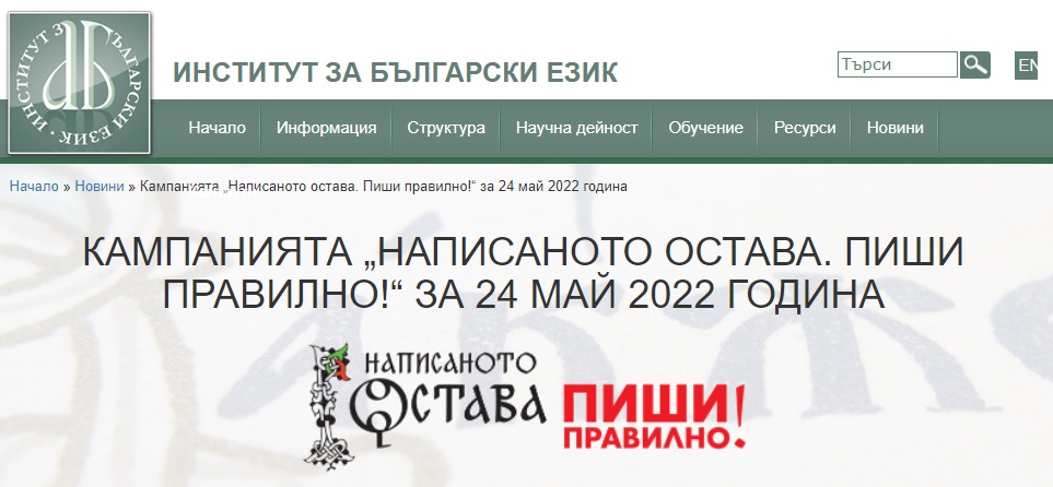 За осма поредна година по случай 24 май-Деня на светите братя Кирил и Методий, на българската азбука, просвета и култура и на славянската книжовност, Институтът за български език “Проф. Любомир Андрейчин” при Българската академия на науките покани българските учители и ученици да се присъединят към кампанията на Института “Написаното остава. Пиши правилно!”. За да проверят знанията си за българския правопис и пунктуация и за да засвидетелстват почитта си към българската просвета и култура, към българските учители, учени, просветители и дейци на културата, участниците трябваше да напишат четливо и красиво под…