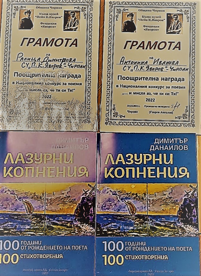 Две специални награди за СУ “П. К. Яворов”, гр. Чирпан в Седмия национален конкурс за рисунка и литературна творба, посветен на 3. Март-144 години от Освобождението на България от османско робство. Конкурсът бе организиран от Народно читалище “Фар – 1946″ и от Община Бургас. НЧ “Фар 1946” Бургас е създадено през 1946 година от културната организация на евреите в Бургас “Иля Еренбург”. Първоначално носи името на Шалом Алейхем – известен еврейски поет. През 1952 година по инициатива на семейство Мария и Петър Златеви се преименува на “Фар”, а от 2010…