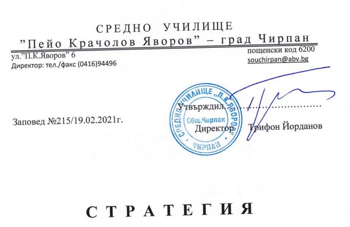 Стратегия за развитие на СУ Пейо Крачолов Яворов – гр. Чирпан за 2021-2025г. Утвърден на педагогически съвет № 6 от 16. Фев. 2021г.