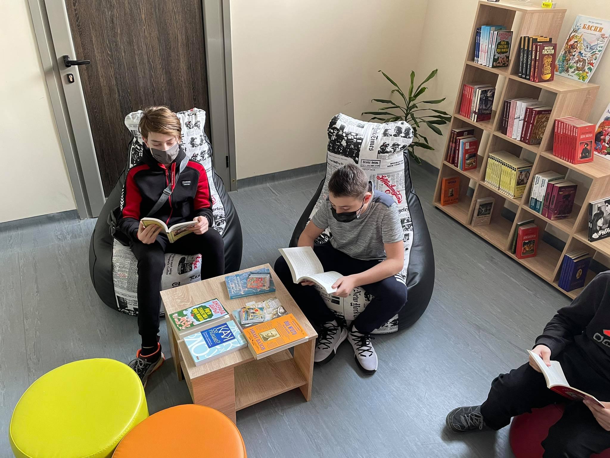 Национална програма “Осигуряване на съвременна образователна среда”, Модул “Библиотеките като образователна среда”. Снимките са от обособения “Кът за четене”, превърнал се в едно от най-желаните места в училище – неформална уютна читателска среда, обогатен с нова съвременна литература и обзавеждане. Проведените инициативи ще популяризират библиотеката като място, в което се насърчава мисленето, въображението и творчеството като част от учебния процес.