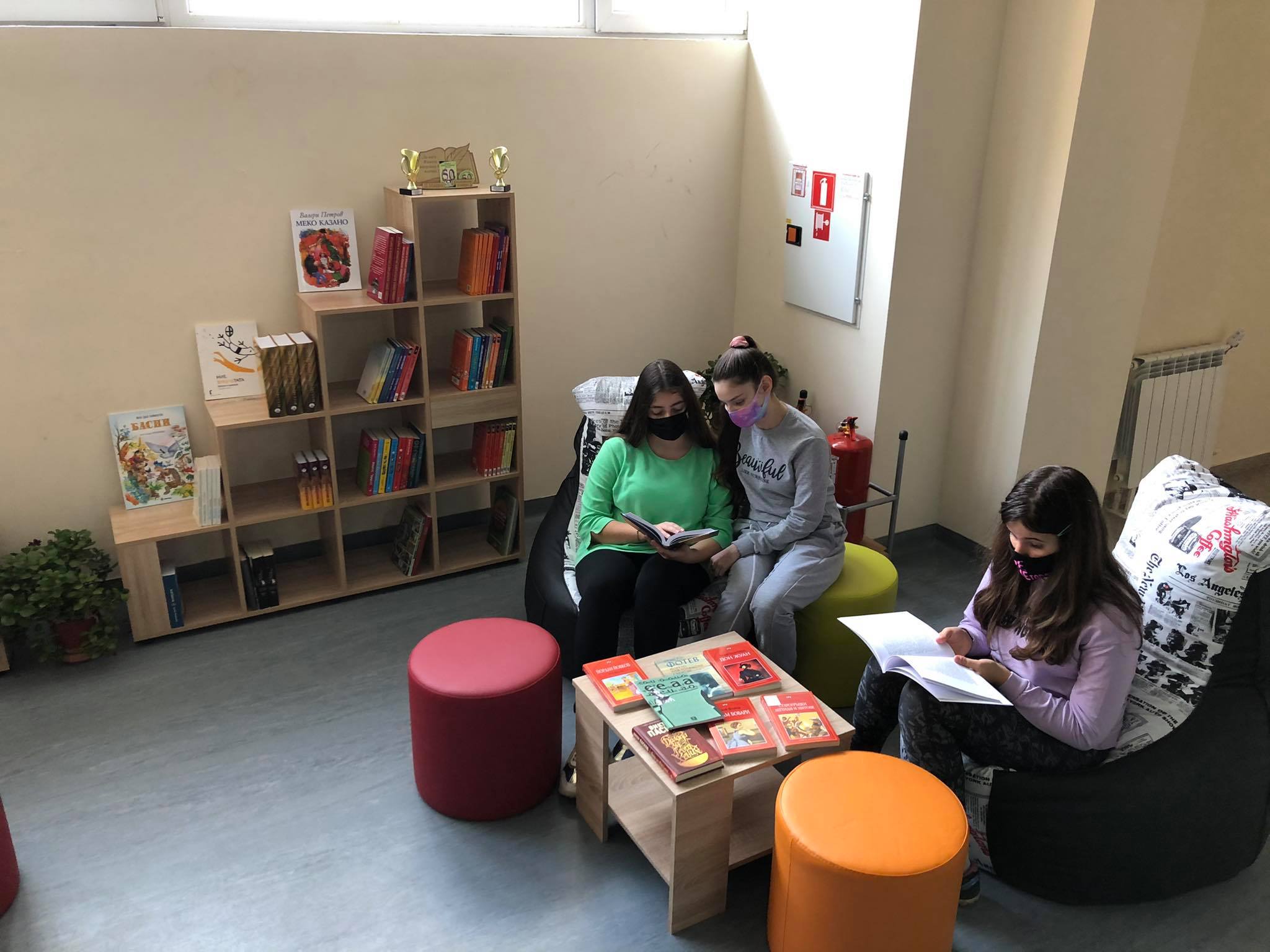 Национална програма "Осигуряване на съвременна образователна среда", Модул "Библиотеките като образователна среда". Снимките са от обособения "Кът за четене", превърнал се в едно от най-желаните места в училище – неформална уютна читателска среда, обогатен с нова съвременна литература и обзавеждане. Проведените инициативи ще популяризират библиотеката като място, в което се насърчава мисленето, въображението и творчеството като част от учебния процес.