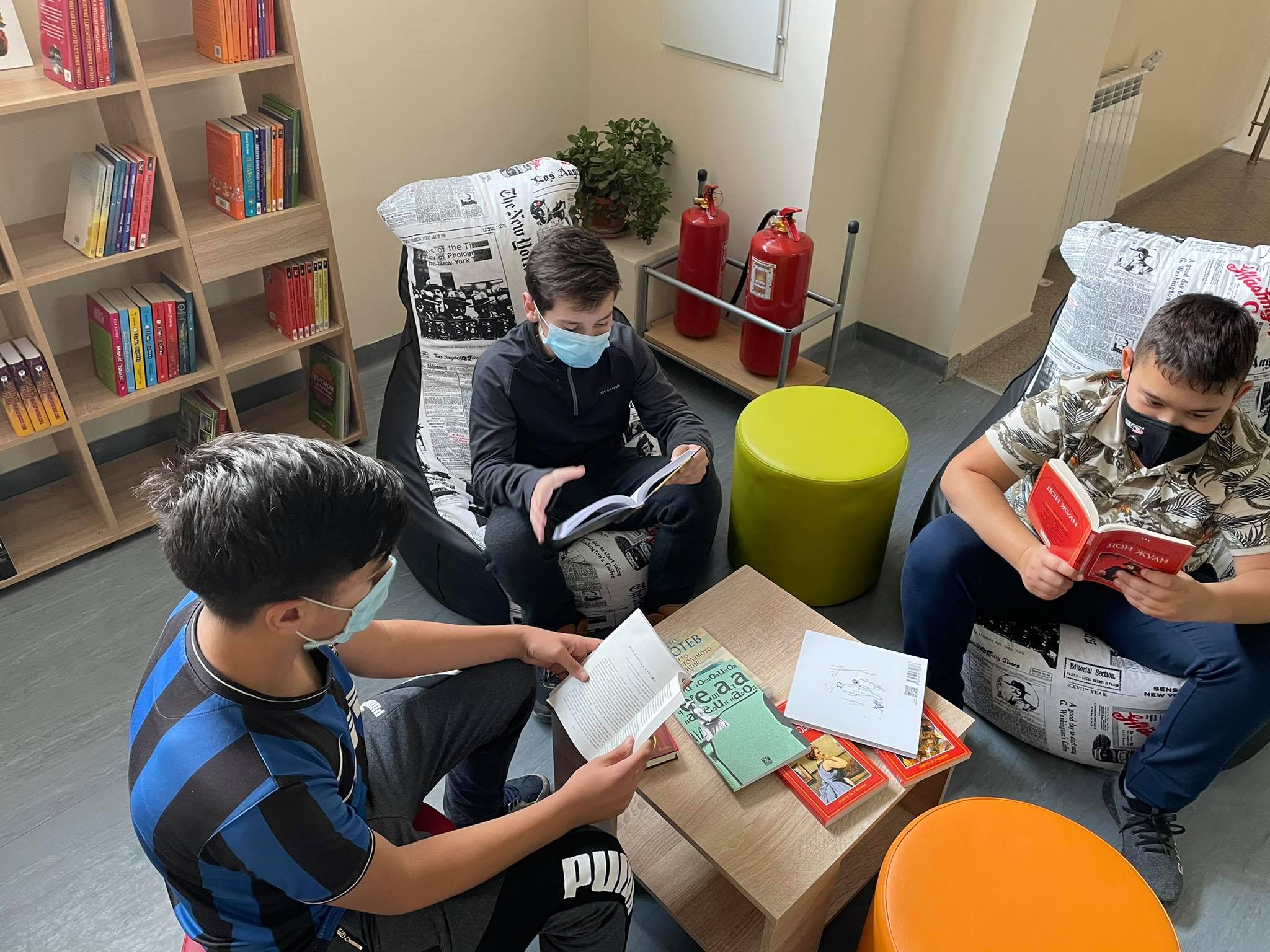 Национална програма "Осигуряване на съвременна образователна среда", Модул "Библиотеките като образователна среда". Снимките са от обособения "Кът за четене", превърнал се в едно от най-желаните места в училище – неформална уютна читателска среда, обогатен с нова съвременна литература и обзавеждане. Проведените инициативи ще популяризират библиотеката като място, в което се насърчава мисленето, въображението и творчеството като част от учебния процес.