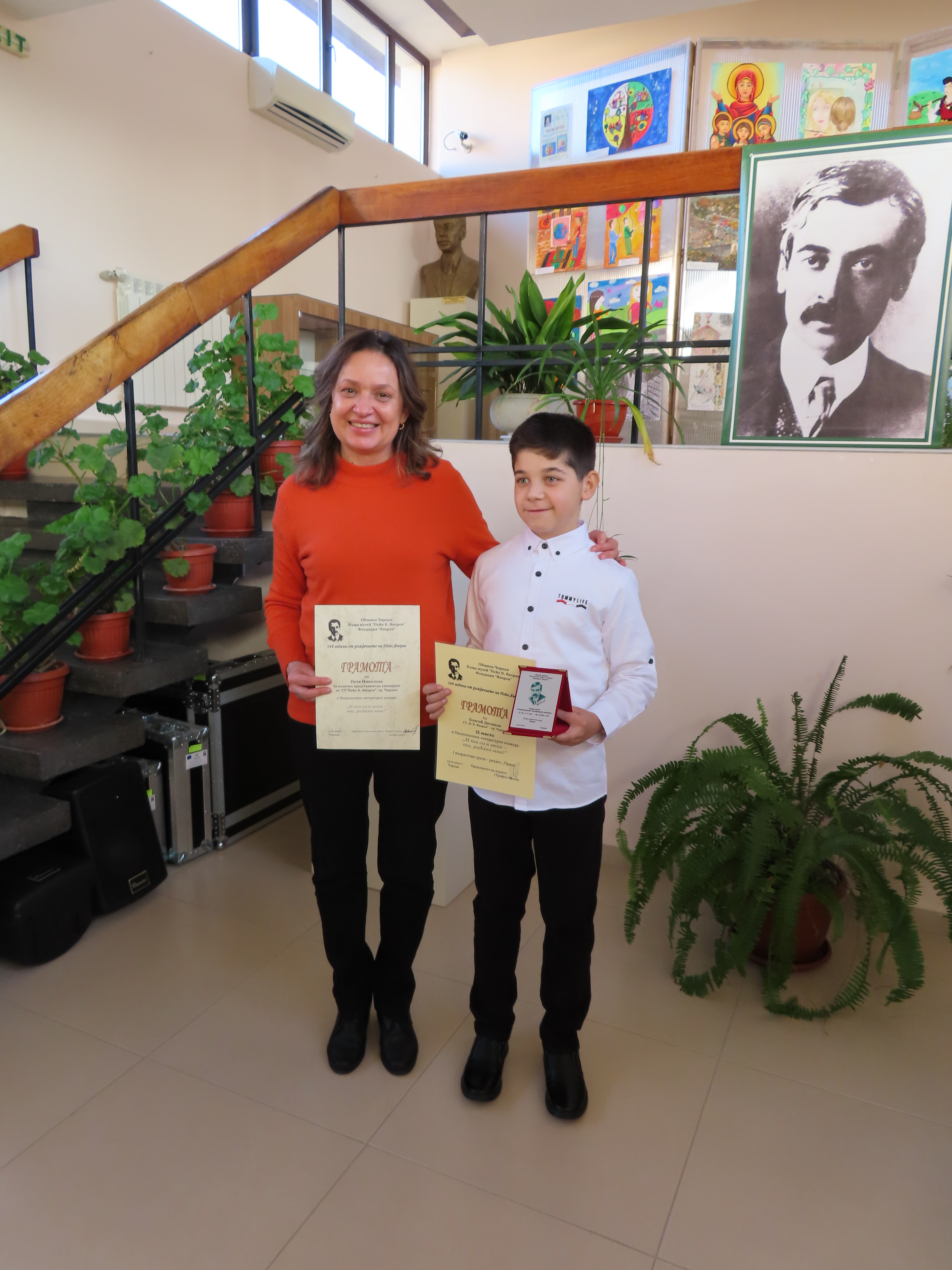 На 19.01.2022 г. в експозиционната зала на Яворовия музей г-жа Ангелина Паскалева, Директор Дирекция “Оксмпт” в Община Чирпан, г-н Тодор Иванов, председател на Фондация “Яворов” и г-жа Златина Колева, директор на къща-музей “Пейо Крачолов Яворов” в град Чирпан връчиха наградите на отличените участници-плакети, книги, тематични календари и химикалки, парична награда. Бяха връчени грамоти и на двамата ръководителите на изявените ученици.