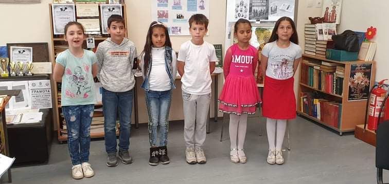 Дария, Теодор, Фатма,Александър, Сияна и Наска от II Б клас изпълняват стихотворението- "Празник" на Веса Паспалеева