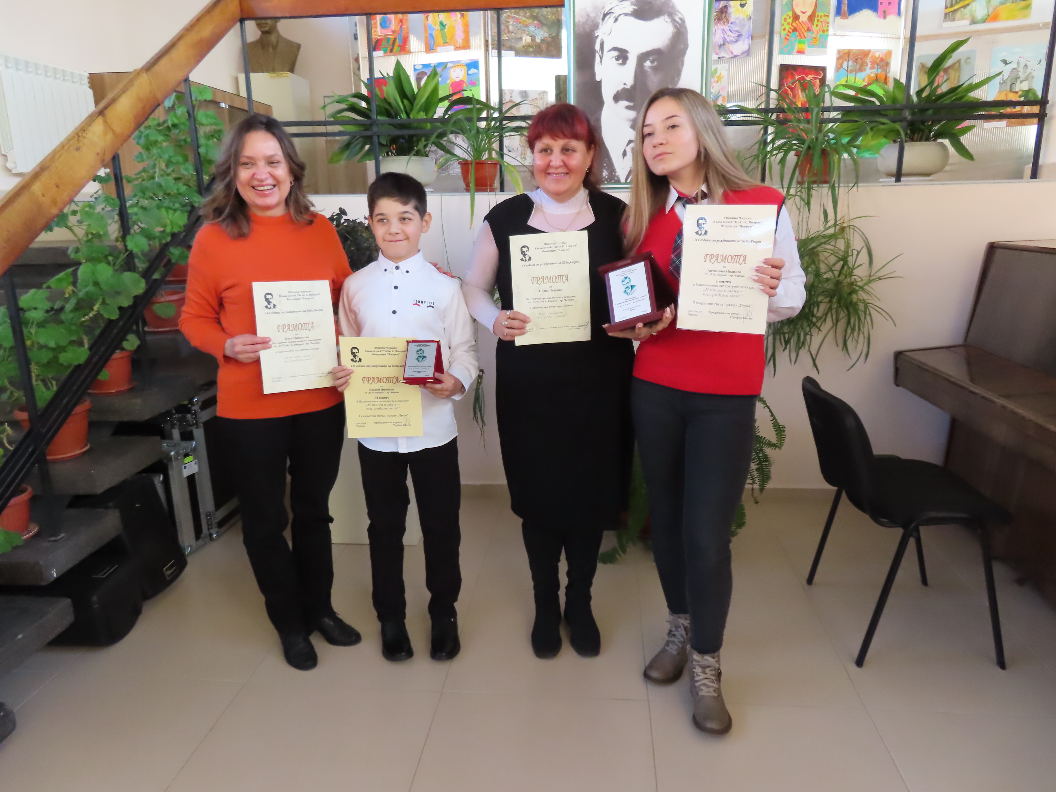На 19.01.2022 г. в експозиционната зала на Яворовия музей г-жа Ангелина Паскалева, Директор Дирекция “Оксмпт” в Община Чирпан, г-н Тодор Иванов, председател на Фондация “Яворов” и г-жа Златина Колева, директор на къща-музей “Пейо Крачолов Яворов” в град Чирпан връчиха наградите на отличените участници-плакети, книги, тематични календари и химикалки, парична награда. Бяха връчени грамоти и на двамата ръководителите на изявените ученици.