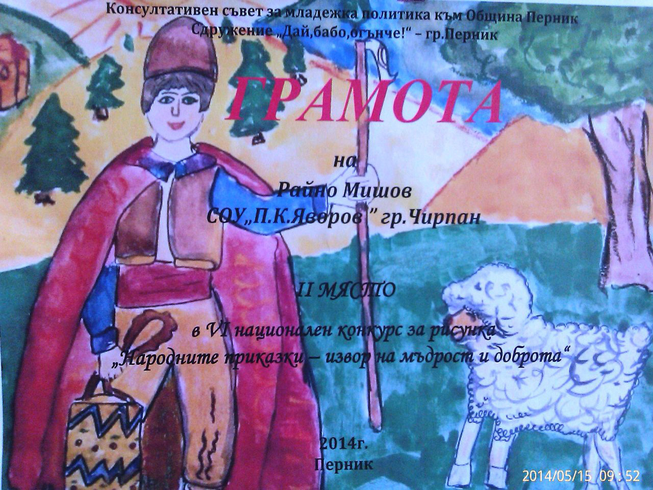 Грамота за участието си получи целият клас, а на Райно Мишов бе присъдено 2-ро място в конкурса и бе награден с медал и грамота. Награда бе връчена от директорa на училището г-жа Ненкова на педагогически съвет.
