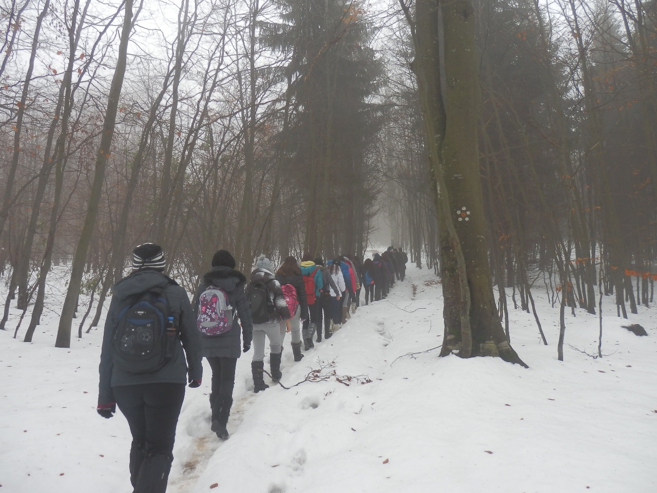 През втория ден на екскурзията проявихме туристическите си възможности. В гъста мъгла и сняг успяхме успешно да покорим връх Шипченски Исполин – 1524 м.н.в. Това се случи и благодарение на нашия водач Иван Мечев, който въпреки затруднените условия не се отказа, намери вярната посока и ни заведе на върха, където мъглата се вдигна и пред нас се разкриха приказни гледки към най-високите части на Стара планина. Въпреки силния вятър на върха всички с чувство на гордост се надпреварвахме да си правим снимки с националния флаг. Най-емоционално за нас обаче беше слизането от върха. Тъй като много се пързаляше и беше почти невъзможно да се върви, момчетата правеха пързалки, а момичетата се спускахме с дъждобраните надолу. Доволни и мокри до кости се прибрахме в топлата хижа. След кратка почивка, игри на закрито, поотпочинали, се отправихме към Географския център на България.