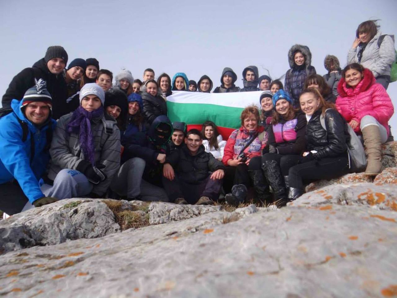 През втория ден на екскурзията проявихме туристическите си възможности. В гъста мъгла и сняг успяхме успешно да покорим връх Шипченски Исполин – 1524 м.н.в. Това се случи и благодарение на нашия водач Иван Мечев, който въпреки затруднените условия не се отказа, намери вярната посока и ни заведе на върха, където мъглата се вдигна и пред нас се разкриха приказни гледки към най-високите части на Стара планина. Въпреки силния вятър на върха всички с чувство на гордост се надпреварвахме да си правим снимки с националния флаг. Най-емоционално за нас обаче беше слизането от върха. Тъй като много се пързаляше и беше почти невъзможно да се върви, момчетата правеха пързалки, а момичетата се спускахме с дъждобраните надолу. Доволни и мокри до кости се прибрахме в топлата хижа. След кратка почивка, игри на закрито, поотпочинали, се отправихме към Географския център на България.