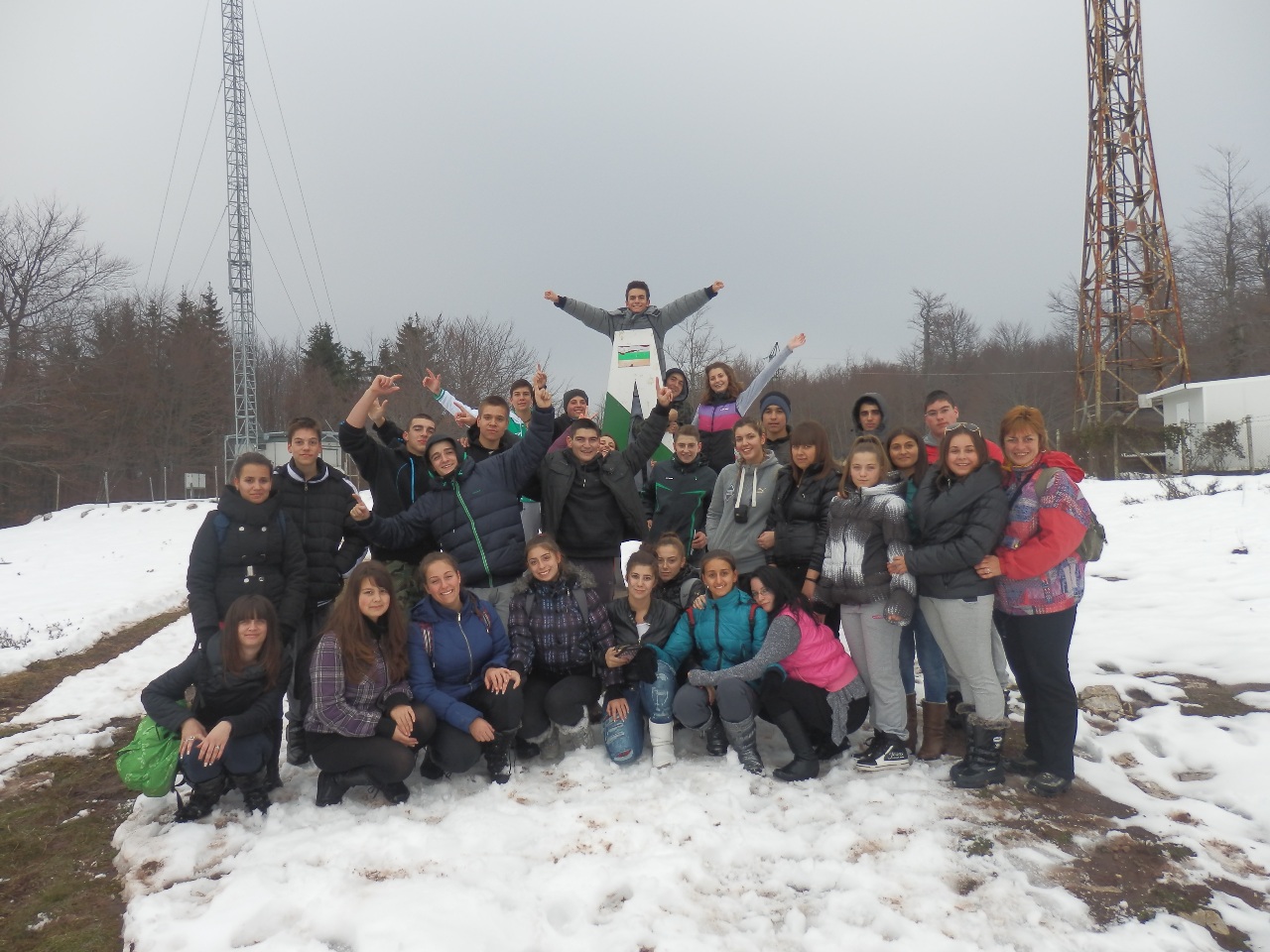 През втория ден на екскурзията проявихме туристическите си възможности. В гъста мъгла и сняг успяхме успешно да покорим връх Шипченски Исполин – 1524 м.н.в. Това се случи и благодарение на нашия водач Иван Мечев, който въпреки затруднените условия не се отказа, намери вярната посока и ни заведе на върха, където мъглата се вдигна и пред нас се разкриха приказни гледки към най-високите части на Стара планина. Въпреки силния вятър на върха всички с чувство на гордост се надпреварвахме да си правим снимки с националния флаг. Най-емоционално за нас обаче беше слизането от върха. Тъй като много се пързаляше и беше почти невъзможно да се върви, момчетата правеха пързалки, а момичетата се спускахме с дъждобраните надолу. Доволни и мокри до кости се прибрахме в топлата хижа. След кратка почивка, игри на закрито, поотпочинали, се отправихме към Географския център на България.