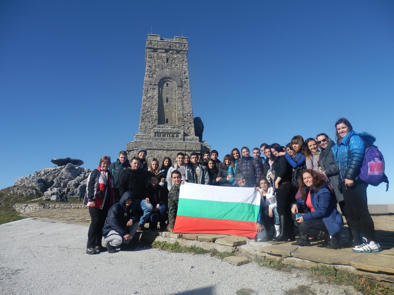 През втория ден на екскурзията проявихме туристическите си възможности. В гъста мъгла и сняг успяхме успешно да покорим връх Шипченски Исполин – 1524 м.н.в. Това се случи и благодарение на нашия водач Иван Мечев, който въпреки затруднените условия не се отказа, намери вярната посока и ни заведе на върха, където мъглата се вдигна и пред нас се разкриха приказни гледки към най-високите части на Стара планина. Въпреки силния вятър на върха всички с чувство на гордост се надпреварвахме да си правим снимки с националния флаг. Най-емоционално за нас обаче беше слизането от върха. Тъй като много се пързаляше и беше почти невъзможно да се върви, момчетата правеха пързалки, а момичетата се спускахме с дъждобраните надолу. Доволни и мокри до кости се прибрахме в топлата хижа. След кратка почивка, игри на закрито, поотпочинали, се отправихме към Географския център на България.